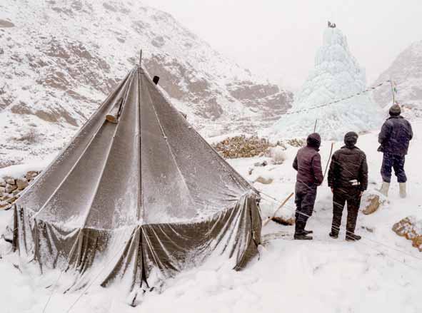 À une demi-heure de marche, au fond de la vallée, se dresse un glacier artificiel d'une vingtaine de mètres de haut. Au Ladakh, le changement climatique est en marche. Le manque d'eau se ressent dans de nombreux villages qui se dépeuplent au fur et à mesure que la sécheresse gagne du terrain. Face à cette problématique, l'ingénieur et activiste ladakhi Sonam Wangchuk a trouvé une solution: les stoupas de glace, ainsi nommés car leur forme rappelle ces monuments omniprésents dans l'Himalaya bouddhiste, contenant des reliques sacrées autour desquelles les pèlerins récitent des mantras.