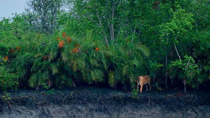 «Flower of Mangrove» – Dans la mangrove indienne, une tigresse surgit sous un hental, incarnation fugace de l’équilibre entre prédateur et forêt. Highly Commended, Wildlife – Mammals