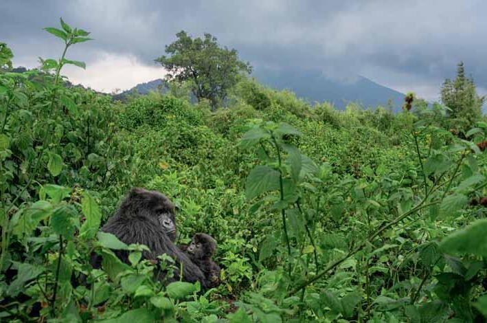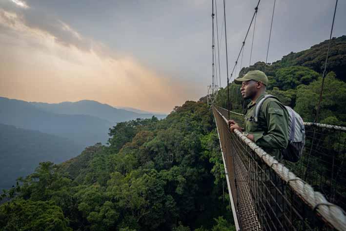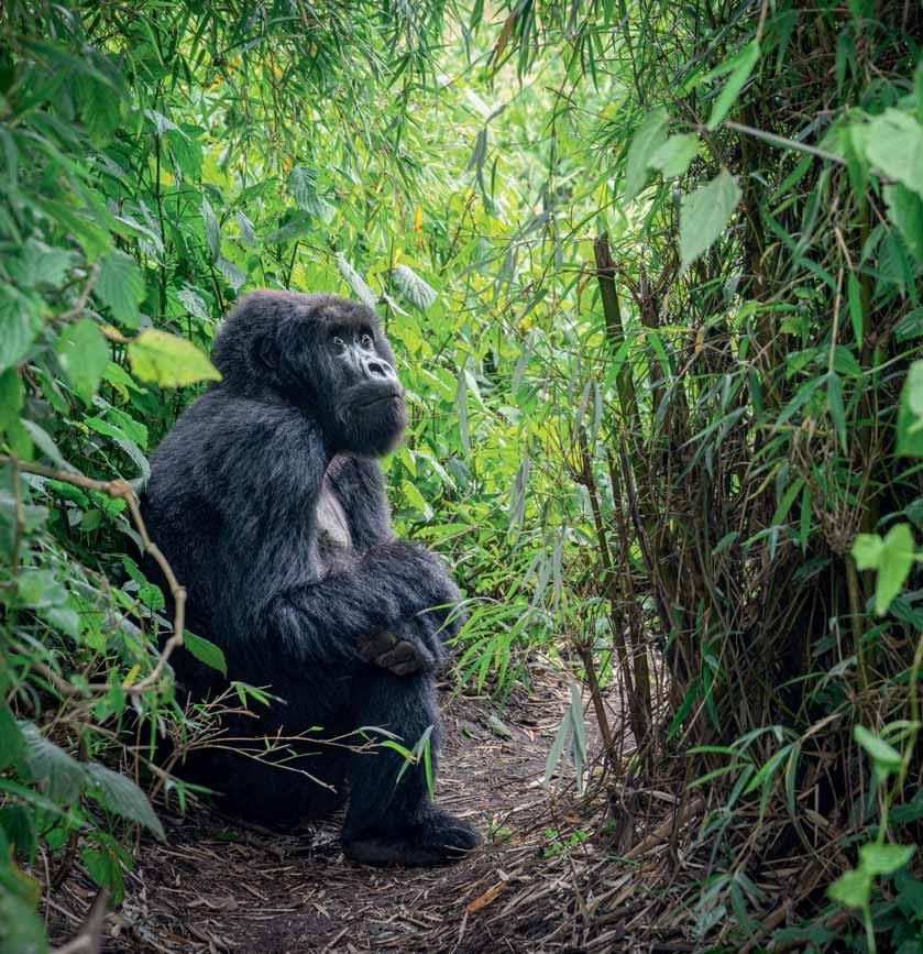 Une femelle gorille et son petit prennent la pose devant la coulisse impressionnante du Parc national des Volcans. Les villages qui bordent le lac Ruhondo conservent un charme résolument rural. Le pont suspendu du Parc national de Nyungwe permet de s’élever au-dessus de la canopée, offrant un point de vue inédit sur la forêt tropicale.