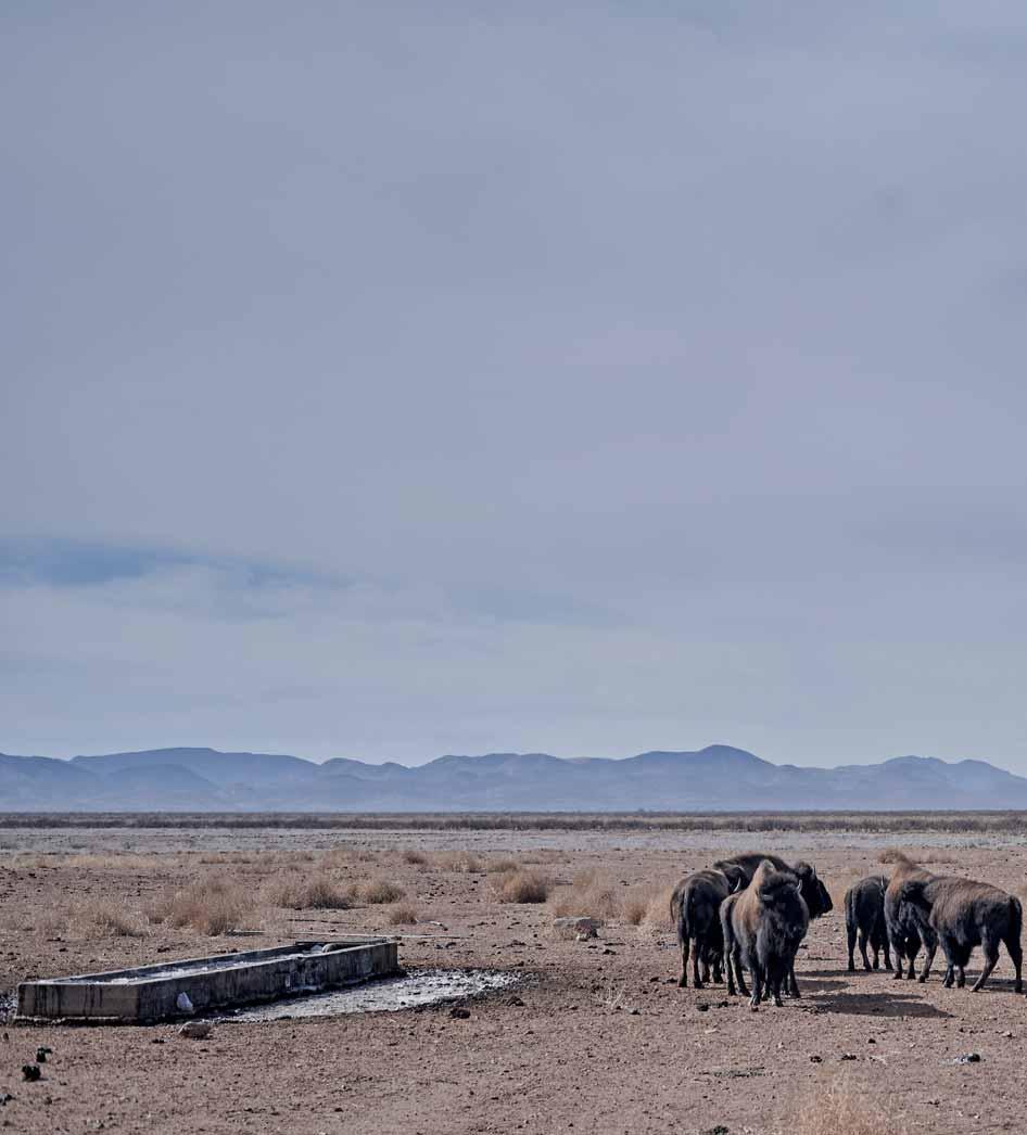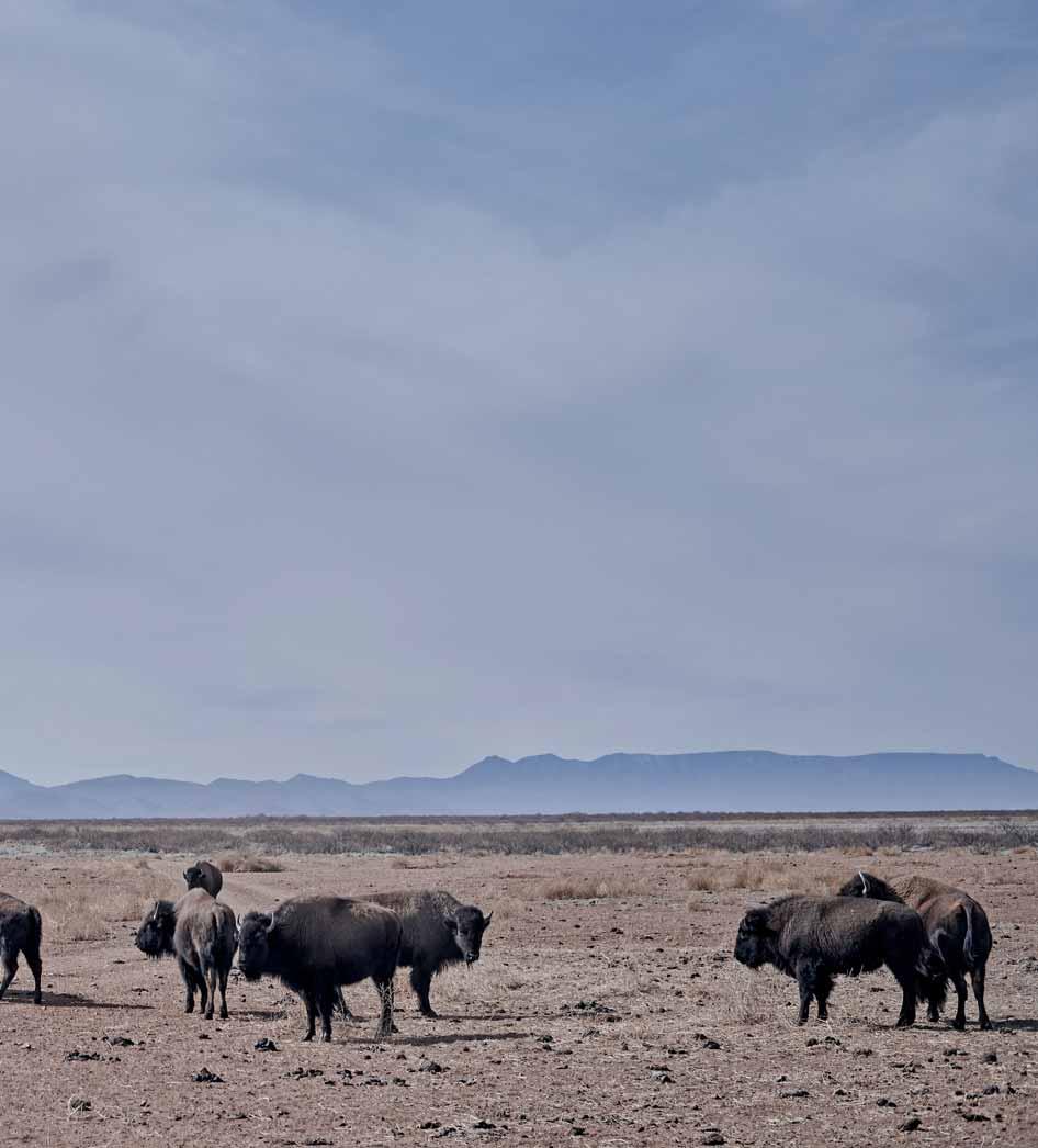 Al’horizon, le regard ne souffre d’aucun obstacle et se perd vers le nord dans une brume fine qui se confond avec le ciel. Les crêtes obscures de la Sierra Madre Occidentale terminant sa course depuis le plateau central mexicain bordent l’ouest tandis que de l’autre coté, quelques montagnes isolées s’élèvent dans la plaine immense. Un troupeau de bisons américains se déplace lentement en colonne, traçant une empreinte rectiligne dans la terre orange. Leurs pas foulent le sol sans bruit.