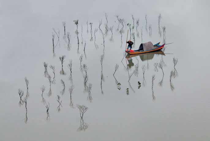 «Hieroglyph» – Vu de loin, un pêcheur traverse de jeunes mangroves dont les formes évoquent une partition végétale. Highly Commended, Conservation and Restoration