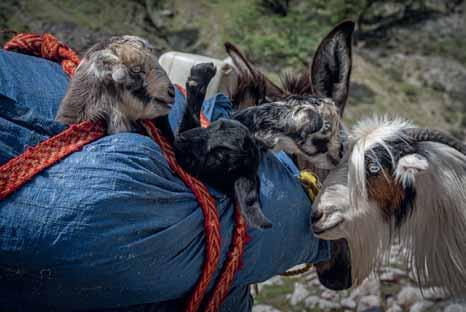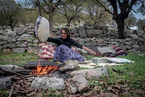 La confection du pain cuit au feu de bois est un rituel quotidien. Toute la famille boit du lait de chèvre frais, réputé plus digeste que celui de brebis. Pas encore assez résistants pour marcher, les chevreaux nouveau-nés sont transportés sur un âne ou un mulet. De temps à autre, la mère s’approche pour câliner sa progéniture.