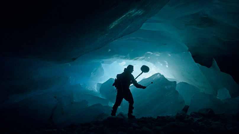 Sous la voûte sombre du glacier de Zinal, le compositeur français Thylacine tend son micro vers l’eau qui s’échappe de la langue glaciaire. L'image, saisie dans la pénombre bleutée de la cavité, montre l’artiste à l’écoute d’un ruissellement profond, mêlé au craquement lent de la glace. Cette scène est tirée du tournage de Swiss Sounds, un projet mené avec Suisse Tourisme dans le but de créer un morceau uniquement composé de sons collectés à travers le pays. Pour réaliser cette œuvre dévoilée au public en décembre dernier, Thylacine a parcouru toute la Suisse en quête de signatures acoustiques caractéristiques: bruits de la pluie sur l’eau, tintement des cloches à l’alpage, grincement des câbles d’un téléphérique ou clapotis d’un bateau. Les moyens de transport les plus emblématiques ont servi à assurer les déplacements de l’équipe tout en nourrissant la musique. Habitué aux projets itinérants – du Transsibérien à la Namibie – Thylacine poursuit son exploration attentive du monde. Au fil des régions traversées, il révèle une Suisse surprenante et diverse, façonnée autant par ses paysages que par les sons qui les peuplent.