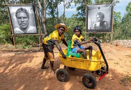 Sur le site sacré de Gulkula, des enfants Yolngu jouent entre les portraits de leurs ancêtres-chefs de clan et d'artistes majeurs : Dula Ngurruwutthun et Wonggu Mununggurr. Leur héritage perdure et inspire les nouvelles générations.