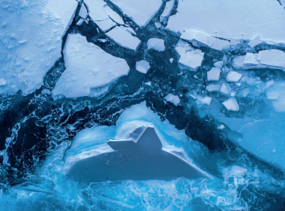 Hightech-Ausrüstung an Bord ermittelt die Eisdicke und optimiert den Weg durch das Packeis. Trotz ihrer Kompaktheit ist diese Schicht aus Meereis wesentlich brüchiger als Landoder Süsswassereis, das von Gletschern stammt, die es am Pol nicht gibt. Unser Schiff aus 6 Zentimeter dickem Stahl hat die «Eisklasse PC 2» und kann mit seinem Bug bis zu 3 Meter mächtige Eisschichten sowie Eisrücken von über 10 Metern brechen! Ich werde nicht müde, von der Reling aus das hypnotisierende Schauspiel zu verfolgen, wie sich der Schiffsrumpf seinen Weg durch das Packeis bahnt: Die Eisschollen werden rissig, platzen auf und heben sich aus dem Wasser. Riesige Eisblöcke kollidieren krachend in der Gischt, sodass ihre aquamarinfarbenen Schichten zutage treten. Dantesk! Noch vor wenigen Jahren war das arktische Packeis viel mächtiger als heute