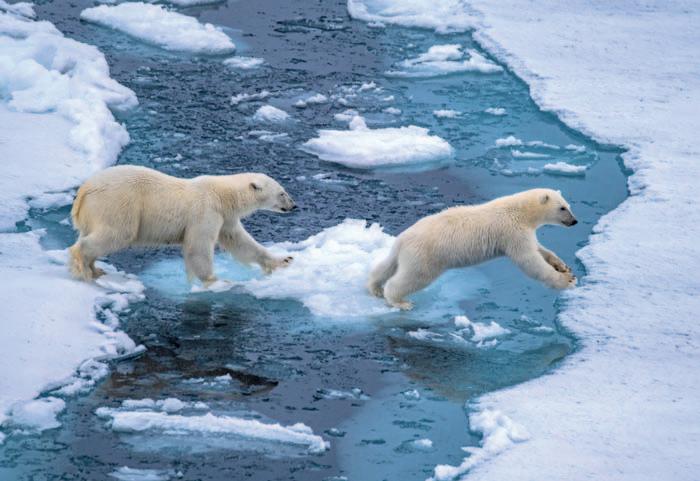 ihrem Jungen Steuerbord voraus meldet, stürzen alle auf das oberste Deck. Wen interessiert beim Anblick seines ersten Eisbären die Polarkälte im Morgengrauen (gefühlte –20 °C), der schneidende Nordwind und der von der Seite kommende Graupel, der einem die Augen verklebt? Es ist ein wahrhaft berührender Moment. Nahe des 89. Breitengrads, also 100 Kilometer vom Nordpol entfernt, auf Eisbären zu treffen, ist erstaunlich. Denn die nächste Küste befindet sich 1500 Kilometer entfernt in Grönland und etwa ebenso weit ist es bis Spitzbergen und Russland.