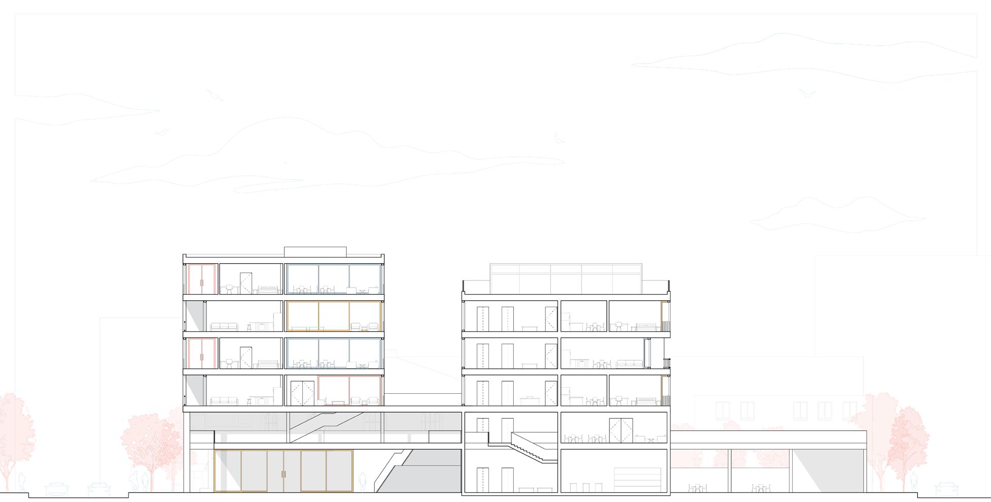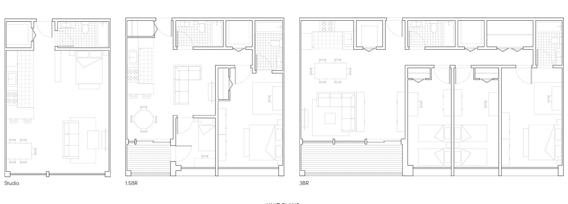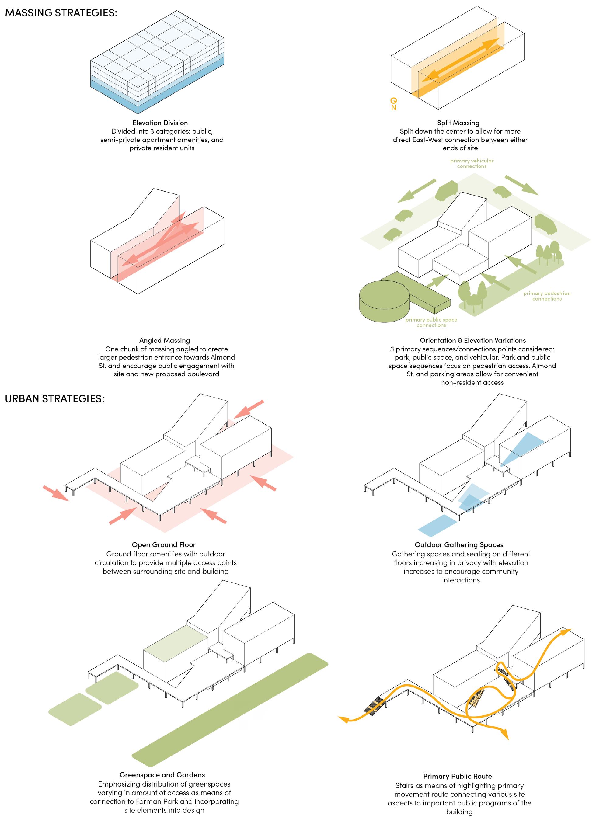 Surrounding site elements such as Almond Street and Forman Park inform overall massing strategies, while goals to create various access points into the site begin to impact the design at a more site-specific scale. Considering differing means of access such as pedestrian and vehicular and public and private, different movement paths are created to meet the various needs associated with each type of access. The project serves as a gathering point for the different groups, or communities, to come together. Programming of public ground floor spaces include a grocery store, retail/dining stalls, and cafes to welcome public building occupants who are not residents. At the unit scale, there are 3 proposed types to allow for a wide range of residents. Units are arranged in an alternating pattern to encourage interaction between these different occupant groups for an additional level of community interaction.