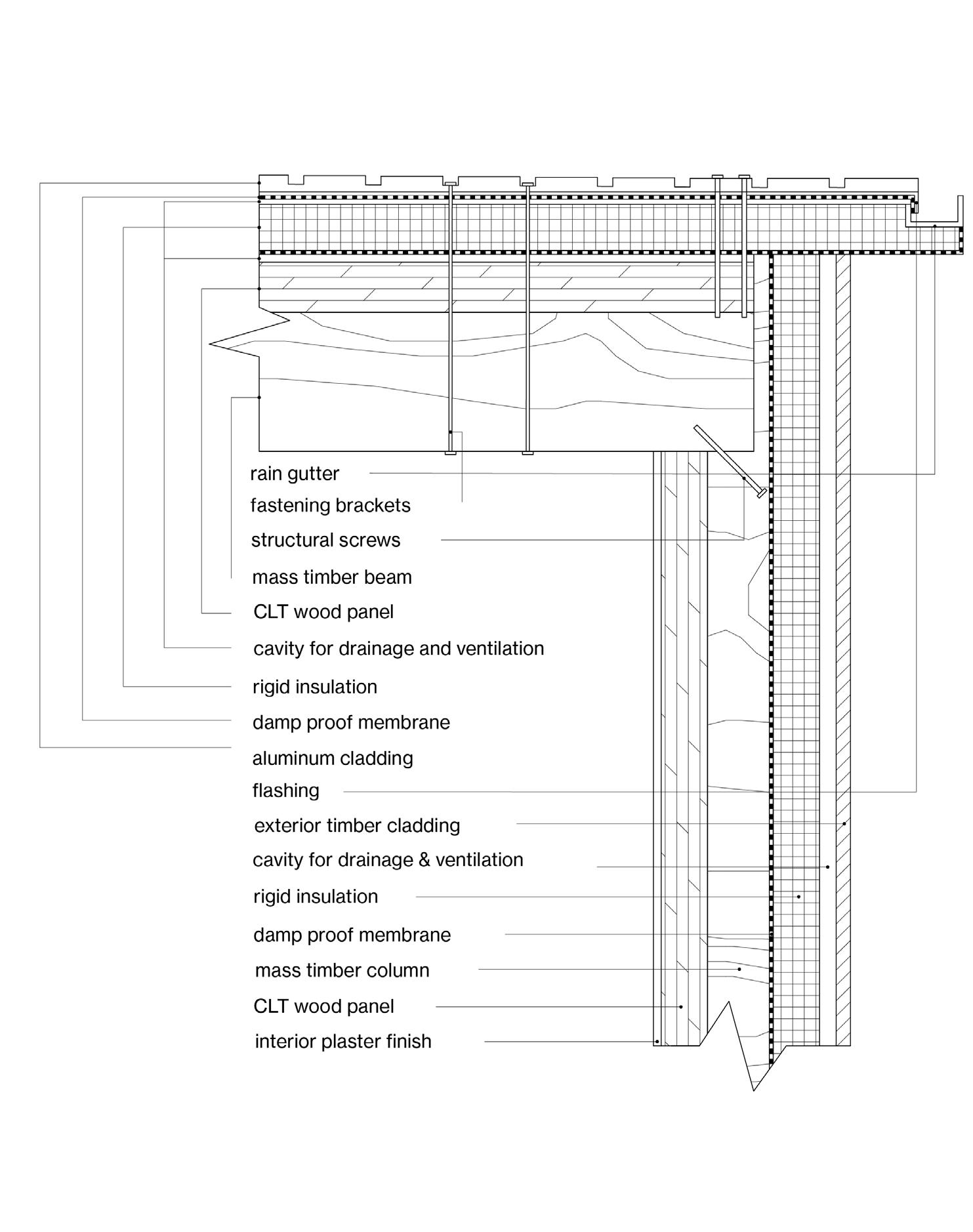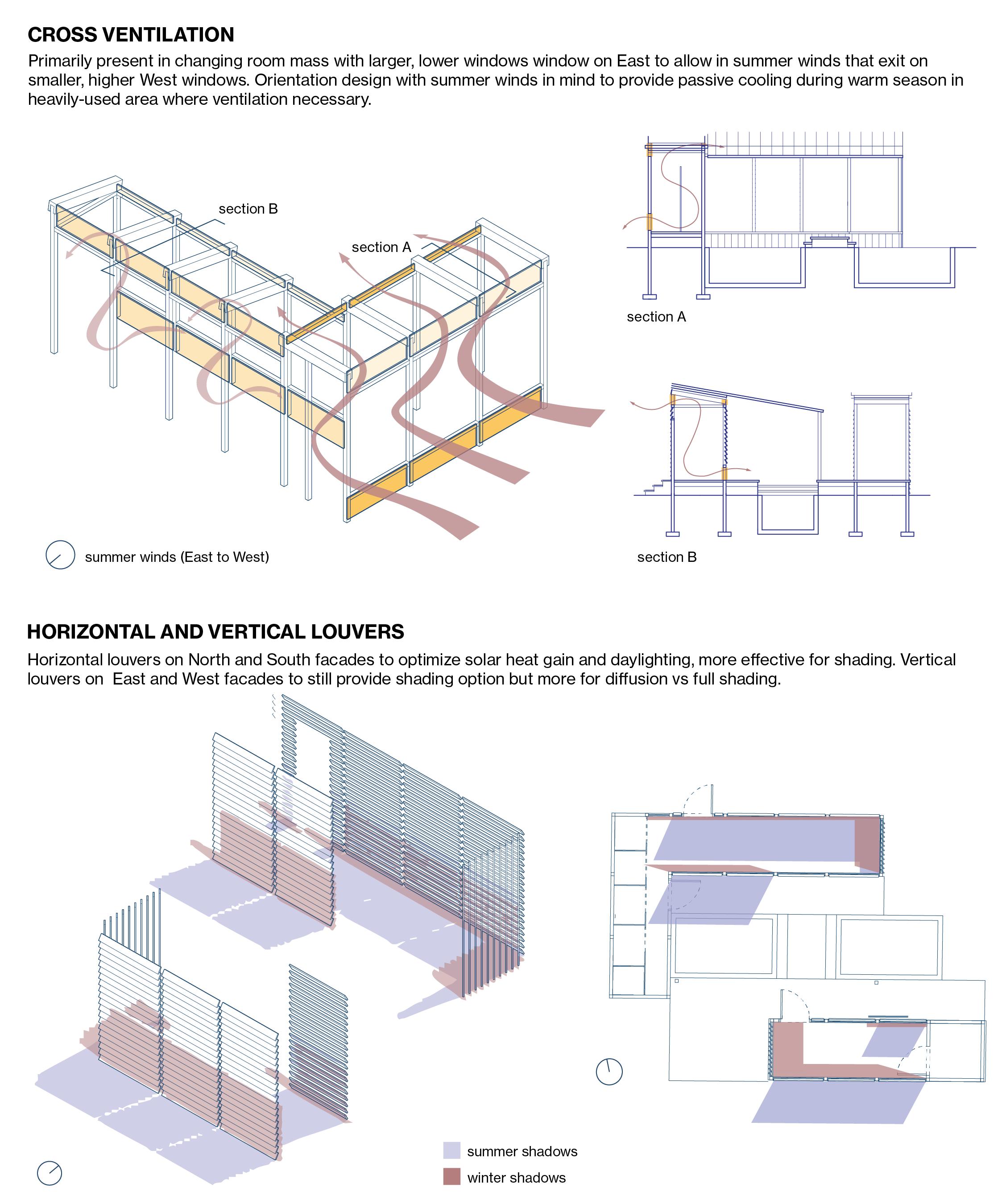 Considering the arid, mild desert climate of the site and its thermal bath programming, a mass timber system was chosen, intentionally oriented to achieve optimal daylighting and ventilation conditions considering the site. Strategies of an isolated sunspace and earth sheltering were also used to achieve additional means of passive heating and cooling fit for the building’s program. Effectiveness of the design strategies were simulated in ClimateStudio to gain a more comprehensive understanding of how the proposed building designed worked with site climate conditions. At a smaller scale, building assembly sections demonstrate exploration of how the timber system is assembled with elements of fenestration, insulation, vapor barriers, and cladding.