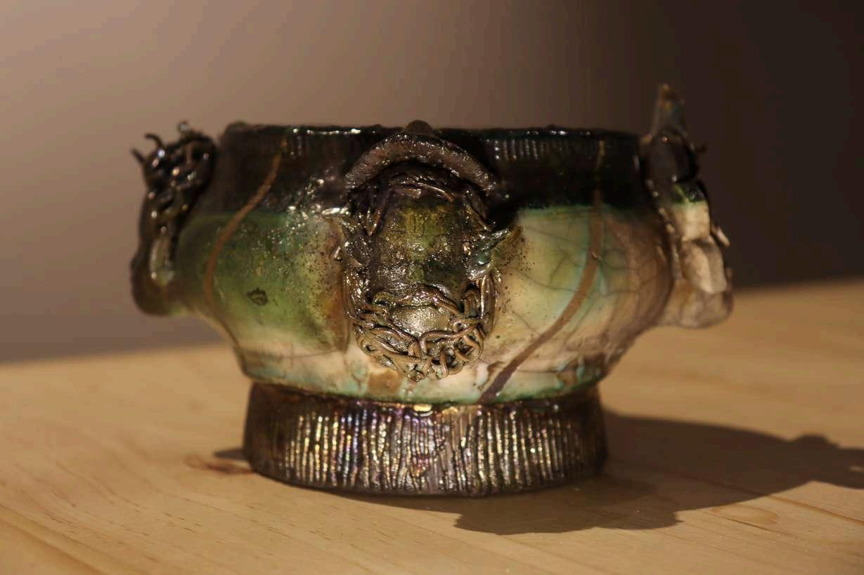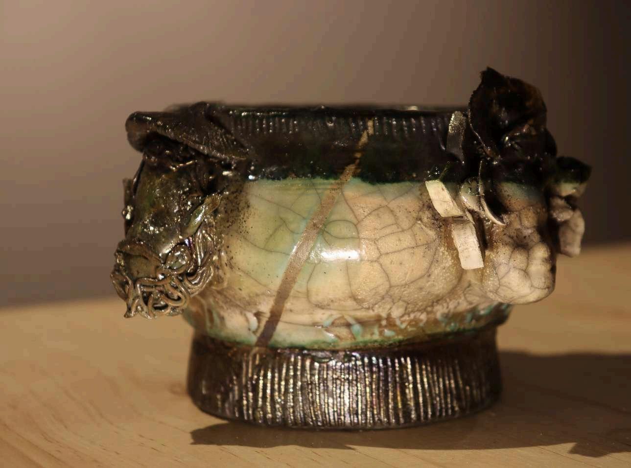 Vasija cerámica en raku sobre esmalte con bórax y sulfato de cobre