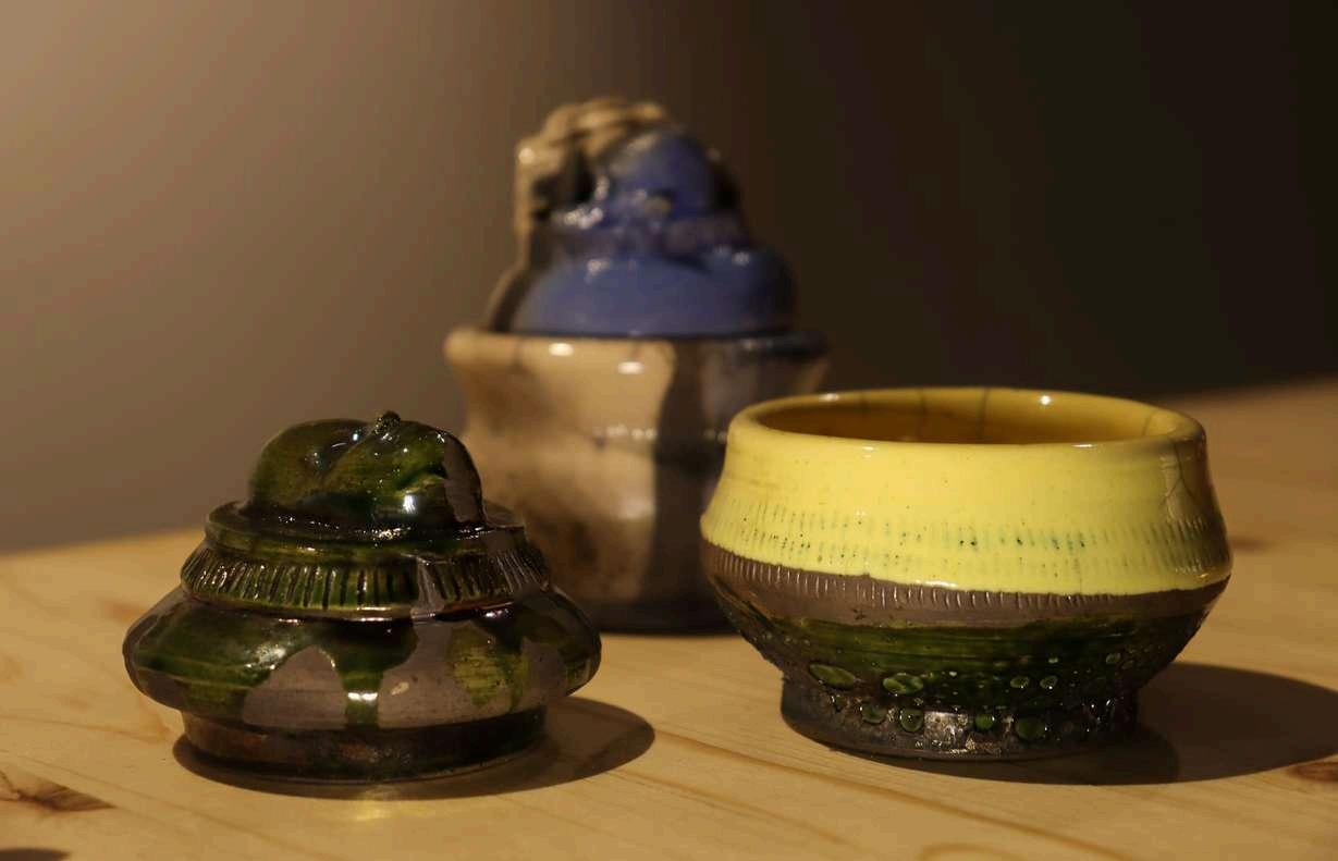 Vasijas cerámicas de arcilla terracota esmaltadas con engobes, frita y cristal.