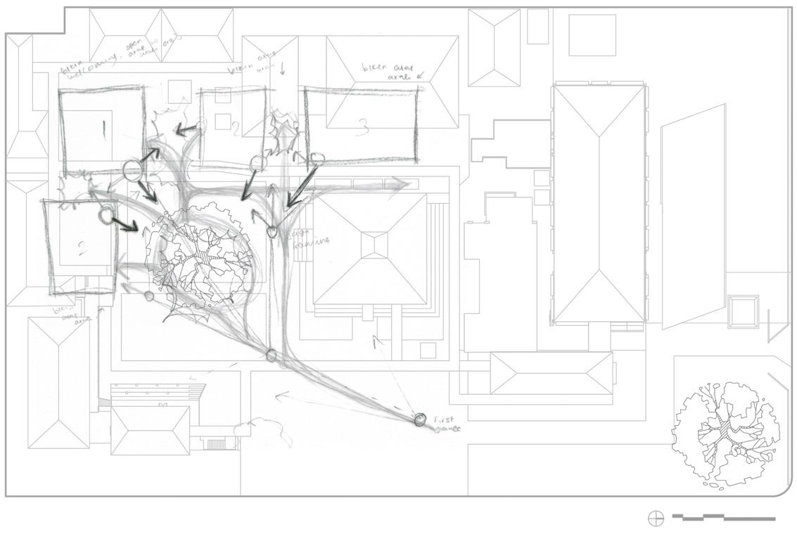 The sketch below shows the probability of the user’s circulation in the proposed massing placement. This sketch helps to design a major and minor pathway—also, a possible entry for the user to enter the massing.