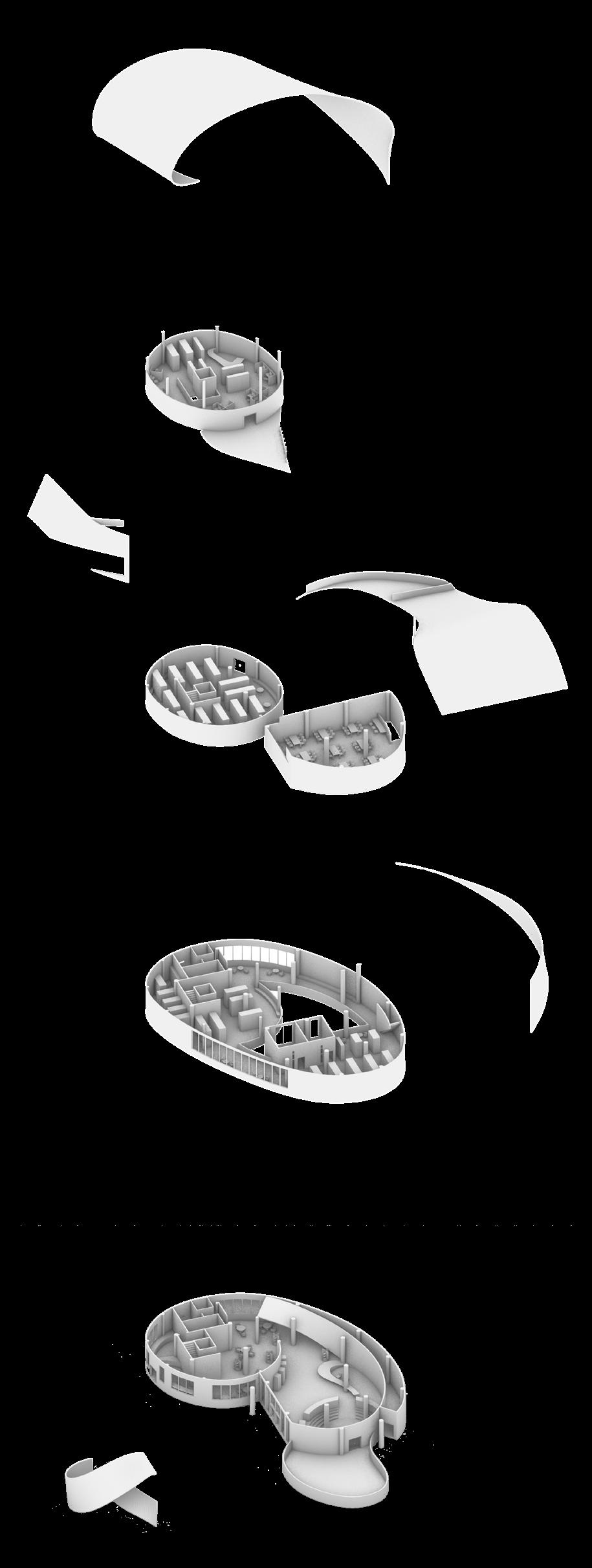 將設計方向設定在流動且扭曲的空間以及區別於周圍建築的流動外觀。將想呈現 的流動空間進一步發想為樓層的錯位以及牆體及樓板的結合,流動的面狀進而發 想出平面的配置及人流動線。