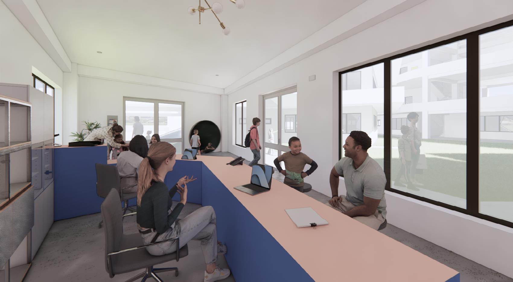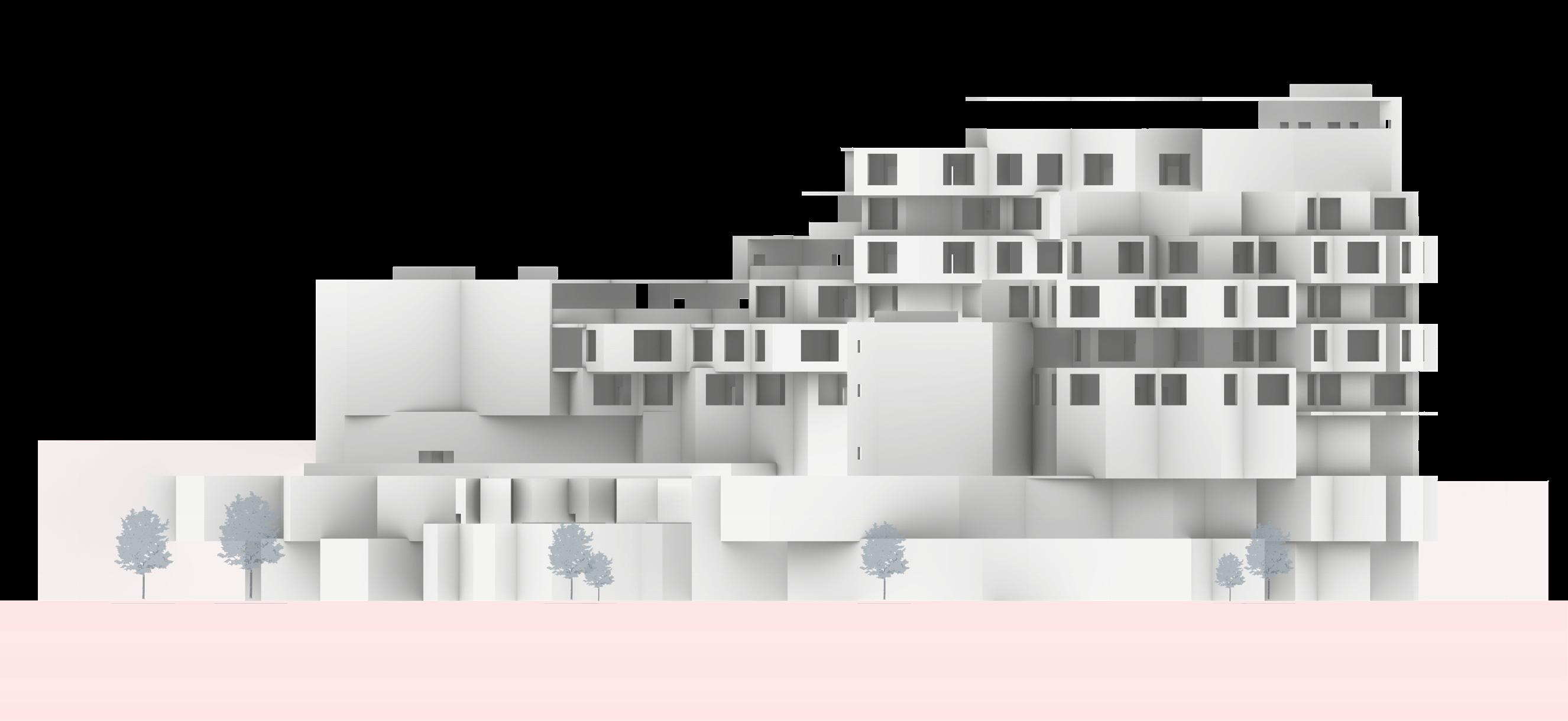 運用基地本身高低差設計加入攀岩 牆,大滑梯,大階梯廣場等遊樂器 材。 以幼童的視角創造街廓,進入校園 後充分感受到被各種房子圍繞的安 全感。