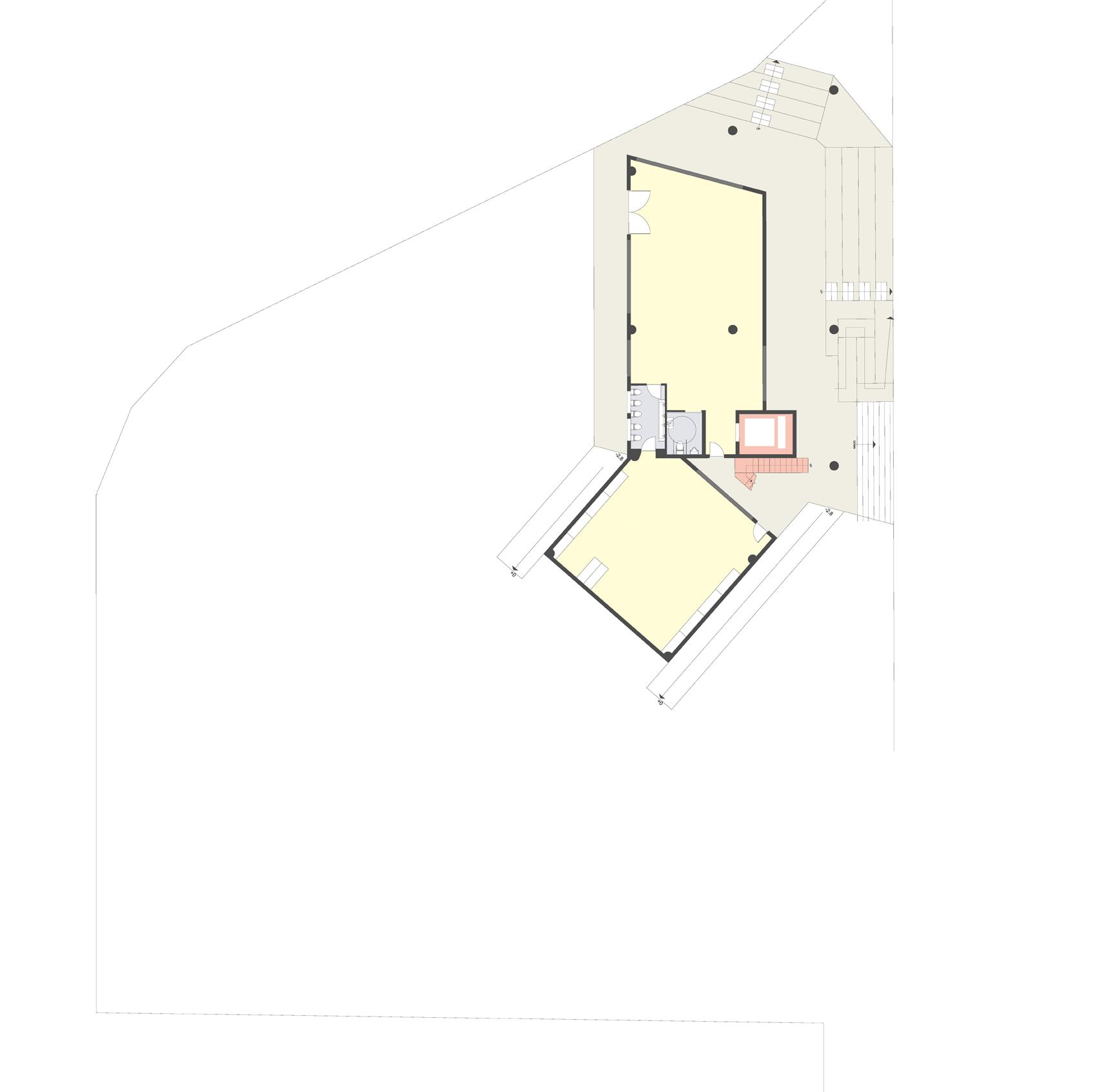 在每個展場旁依附著一間城市客廳,內部以階梯的形式與展場具有高低變化, 且人們也可以直接席地而坐於客廳空間內休息停等以及欣賞不同高度所看見 的商業步行街的人文風景。