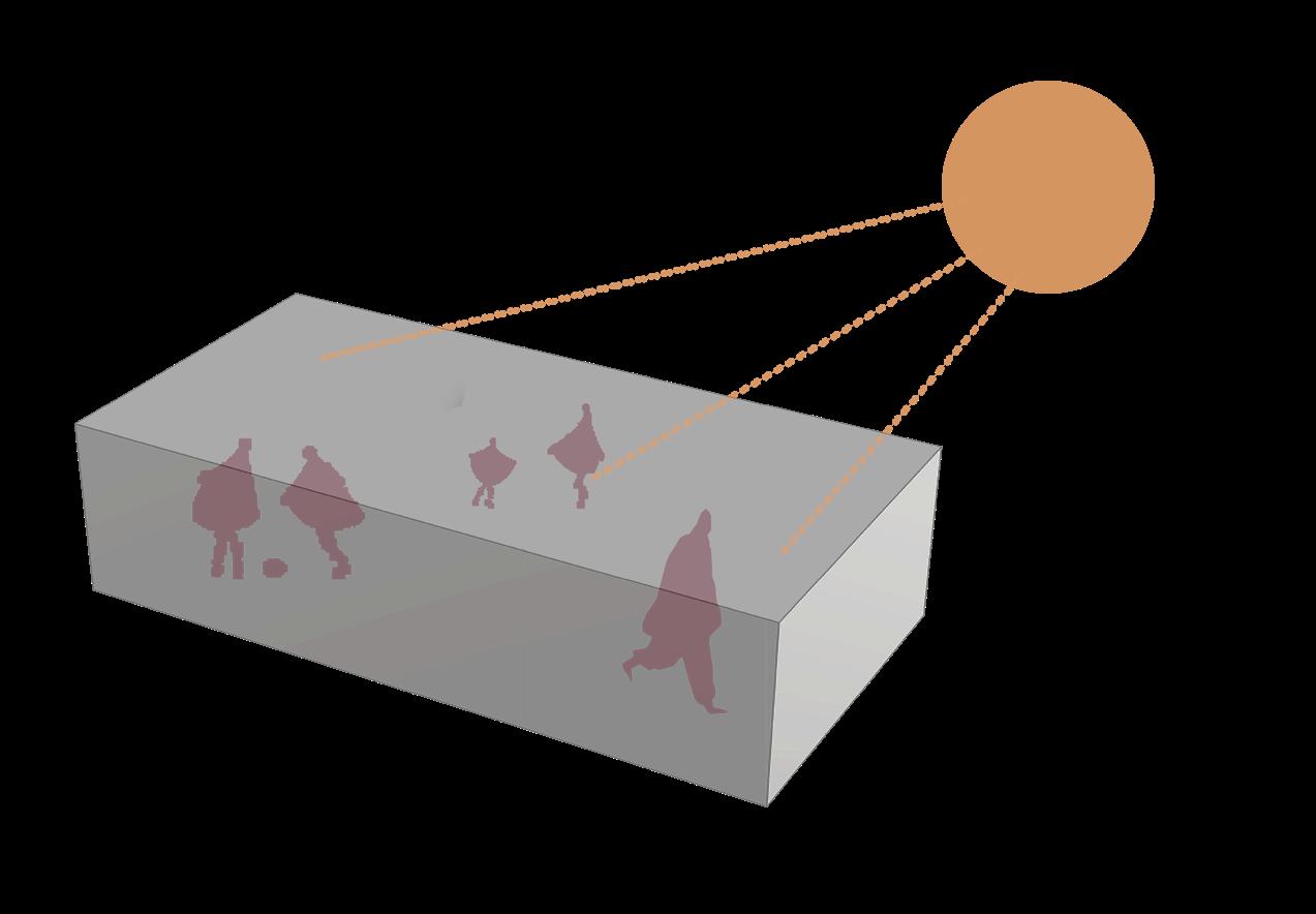 主要為廊道、互動空間及公共演藝活動等空間,帶有頂蓋 遮陽但卻依然保有光線照射以及需許與外界的互動,更注 重人群於建築內的活動。
