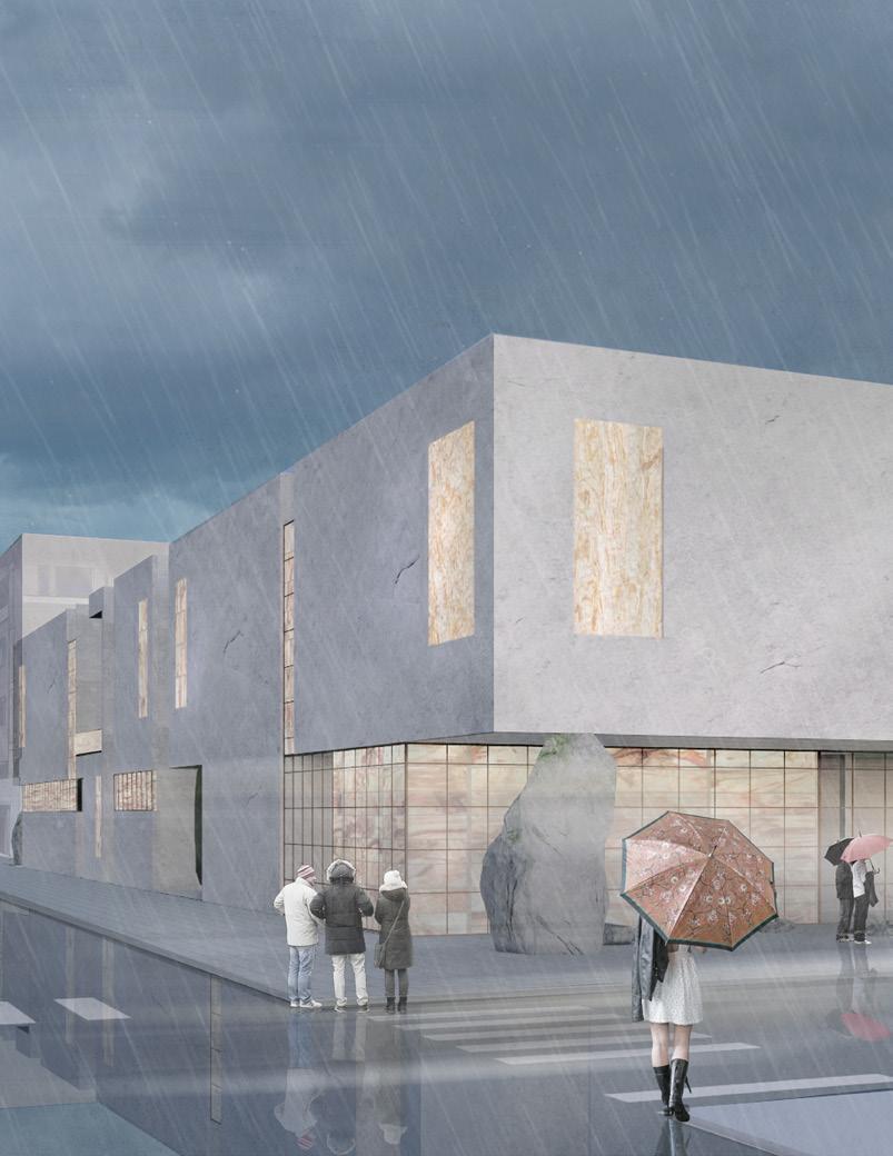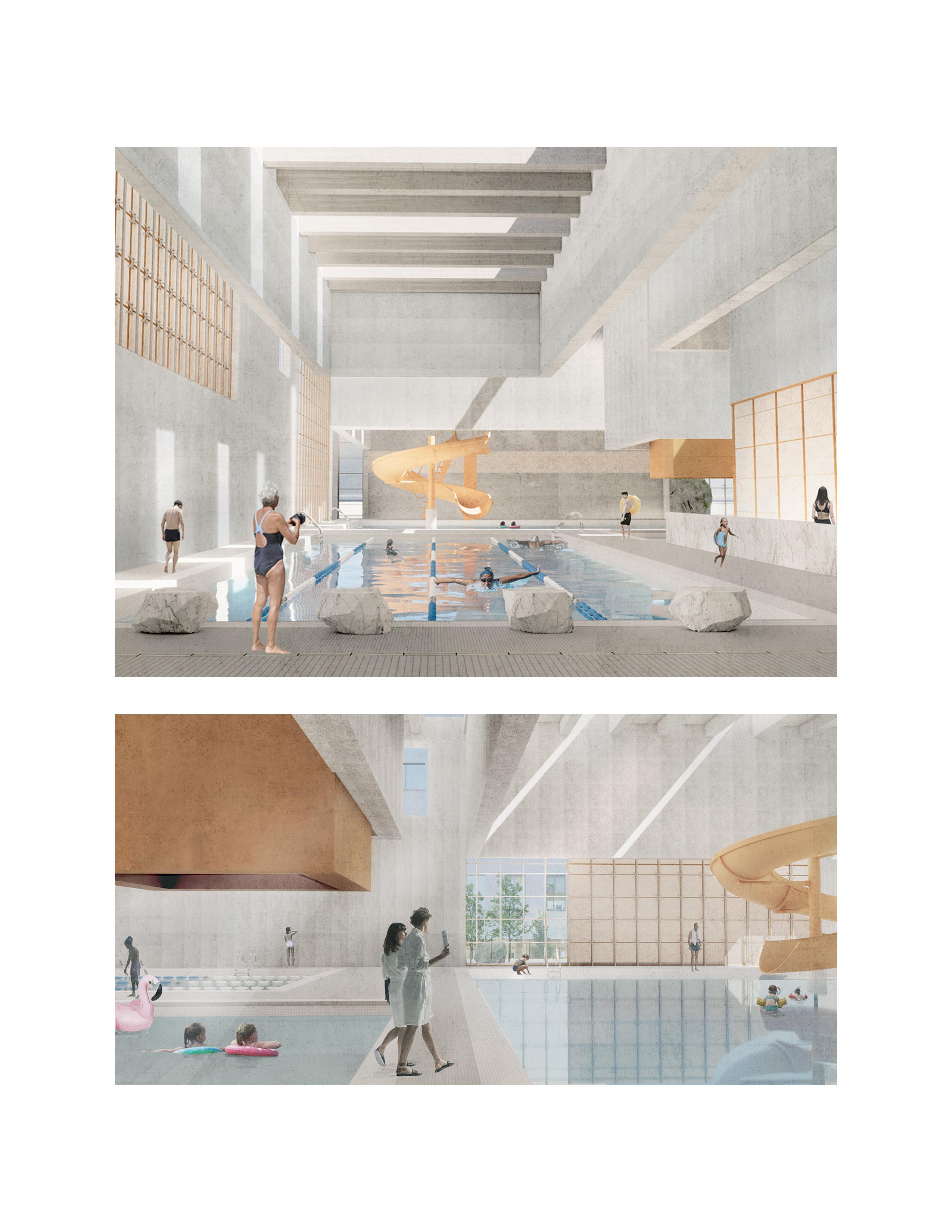 the skylights and nature of the ceiling aim to serve as a guide through the space, while evoking the the sensation of stumbling upon light filtering through a cave passage.