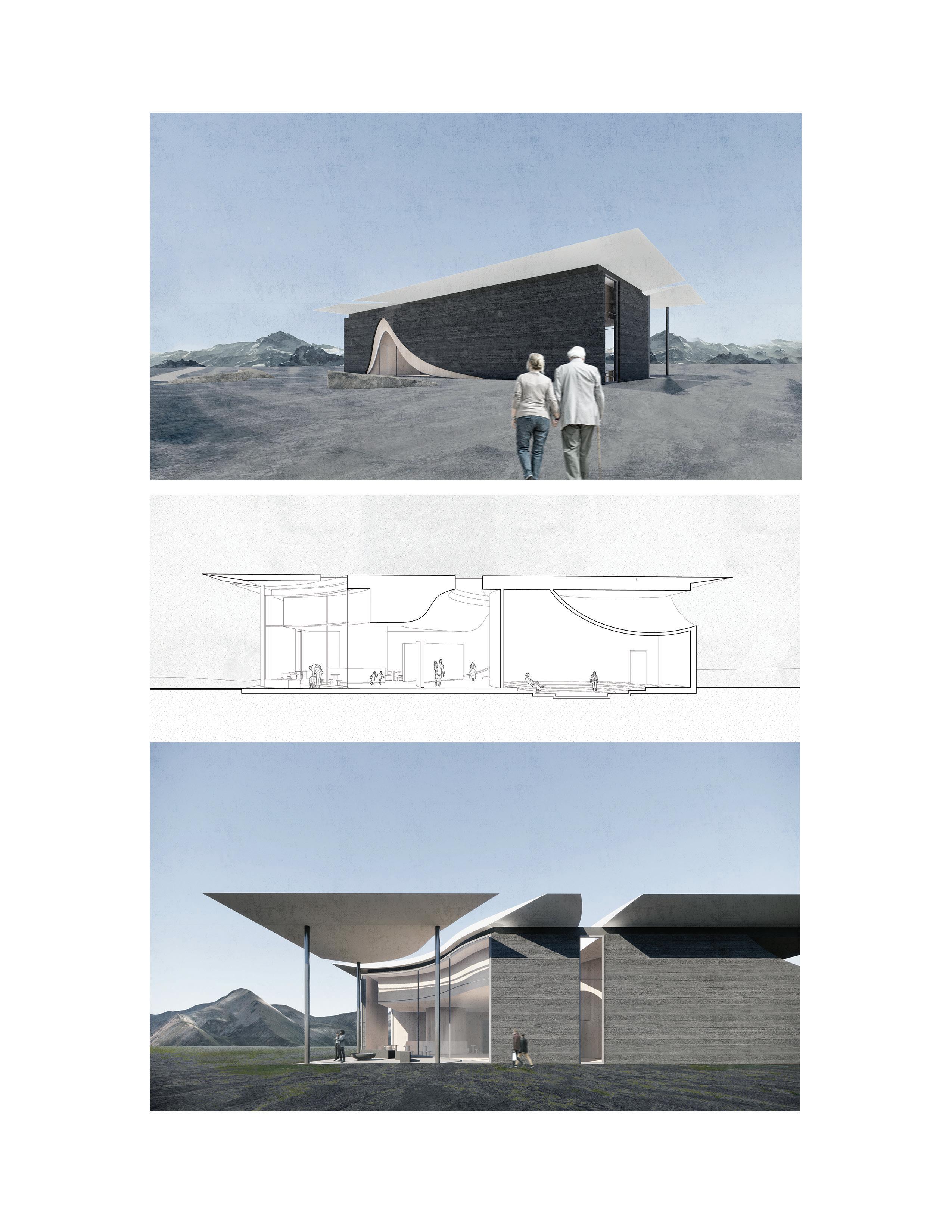 the curved walls are meant to evoke the atmosphere of the caves that sit adjacent to the site. the unexpected and tight nature of the curves aim to immerse the visitor into the space, as caves would.