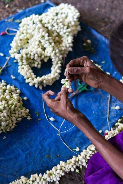 • Strings of jasmine, enlarged in handcarved wood to compliment the scale of the space, adorn the soft lime plaster walls.