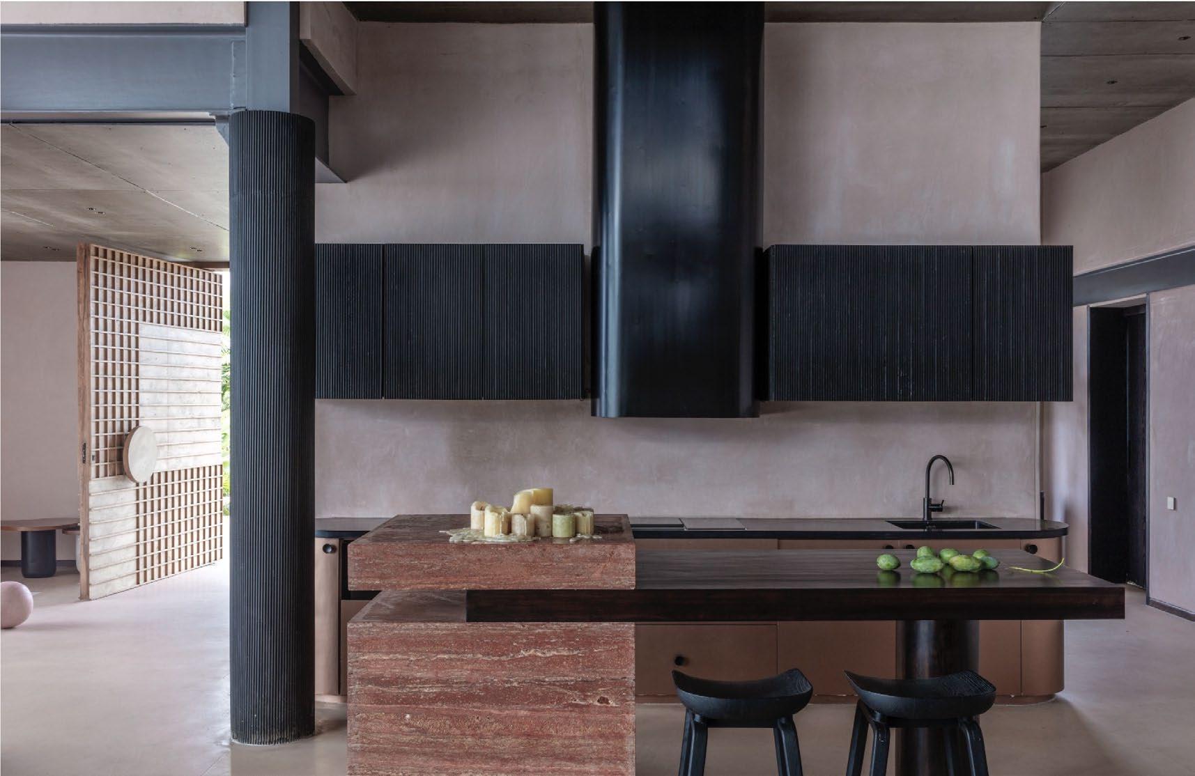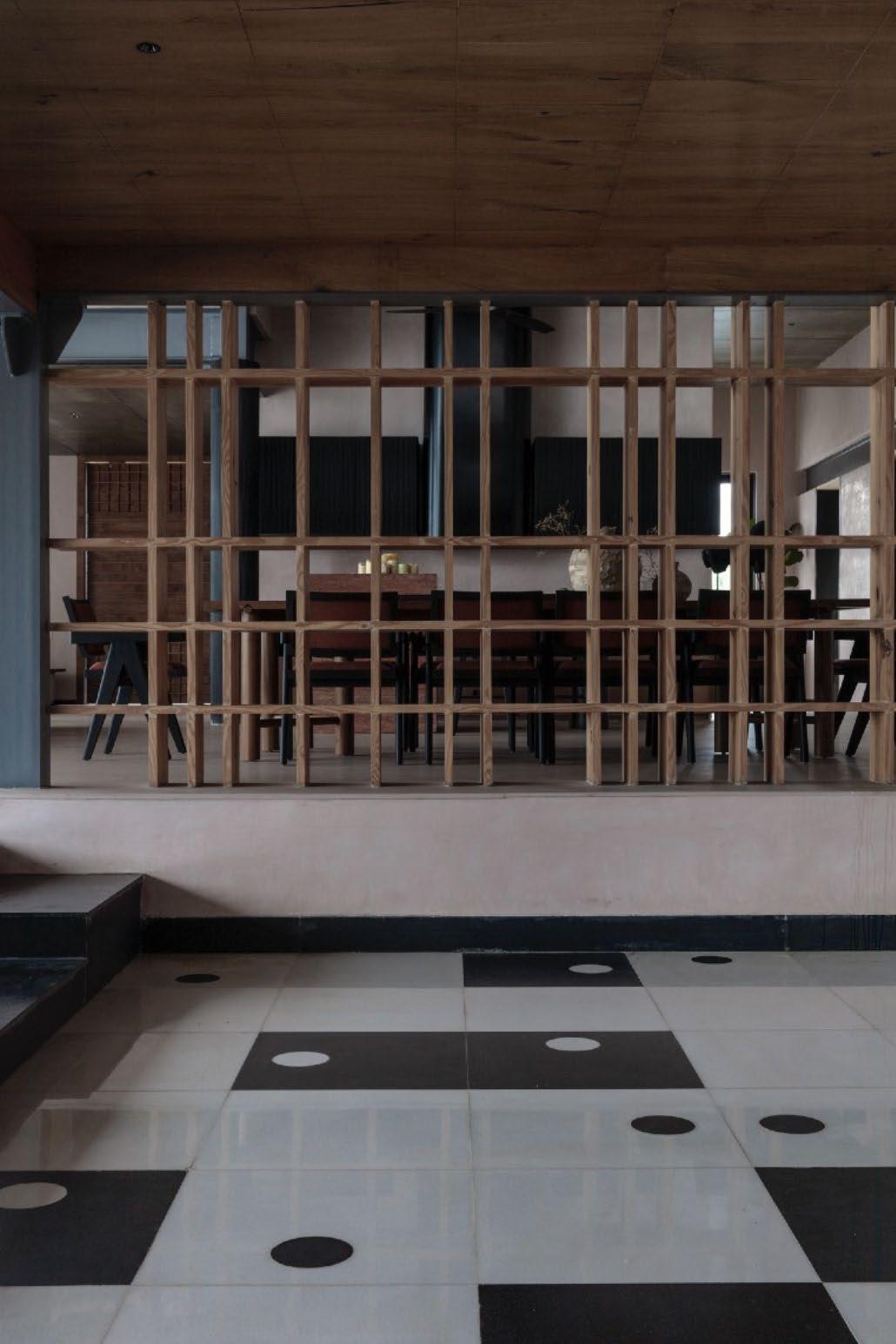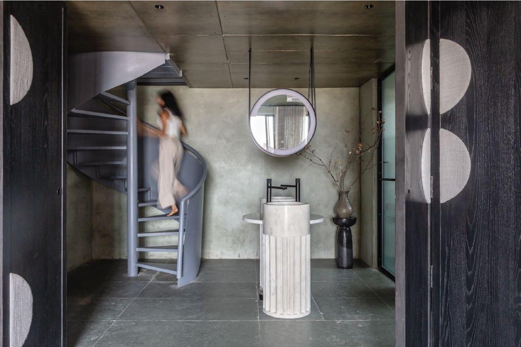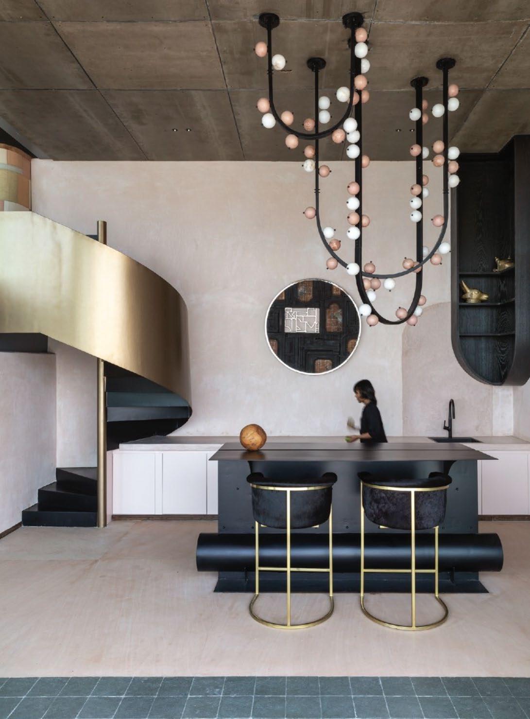 • A monochromatic look was achieved by matching the walls’ limeplaster (a natural material) to the flooring, creating a canvas for the eccentric flooring patterns, dramatic furniture, and boistrous customised lights to take centre stage.