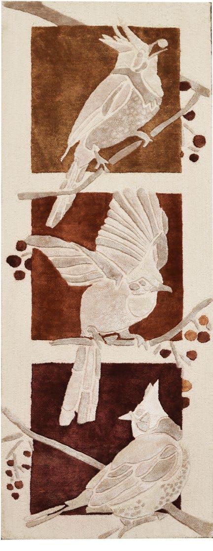 Inspired by the charming bulbul, this chirpy statement rug shines as wall art.