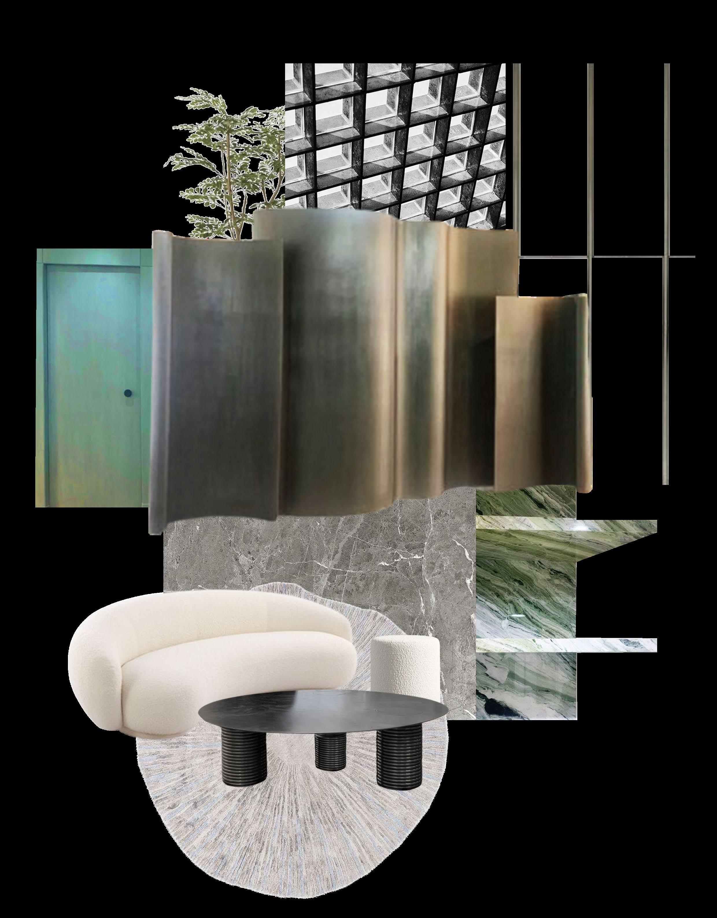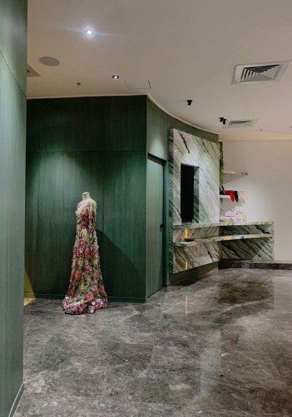 • Cool- toned materials, like metal and a striking green marble, were used experimentally to introduce curves into the space, bringing back the softness- an ode to the designer’s damatic silhouettes.