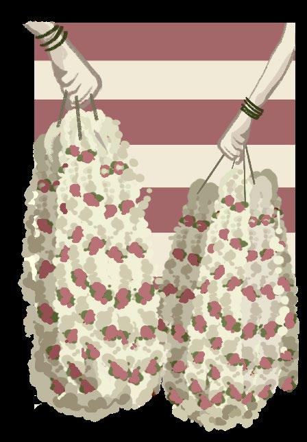 The Bela rug draws inspiration from the scene of a typical morning at a South Indian temple-- women carrying garlands of flowers to sell at the temple stalls before the start of a busy day.