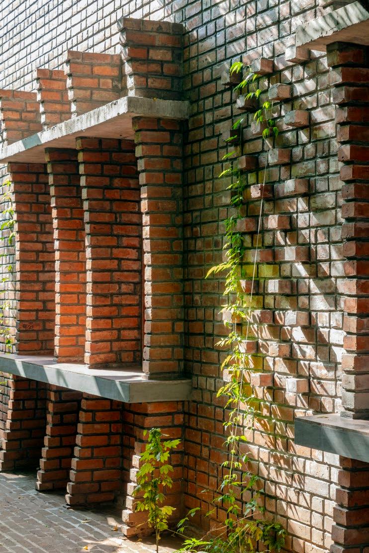 •The exterior features a rat-trap brick bond, the uniformity of which is artfully broken by asymmetrical windows, large conrete planter boxes, and curved brick fins.