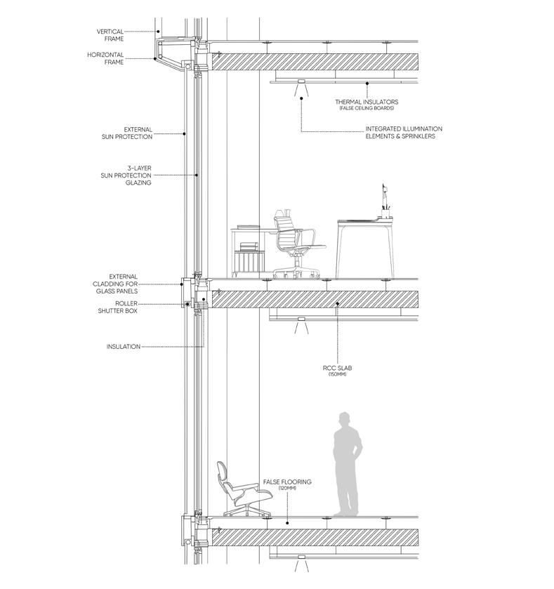 Massing of the building is done in a manner to reduce heat gain and achieve mutual shading.