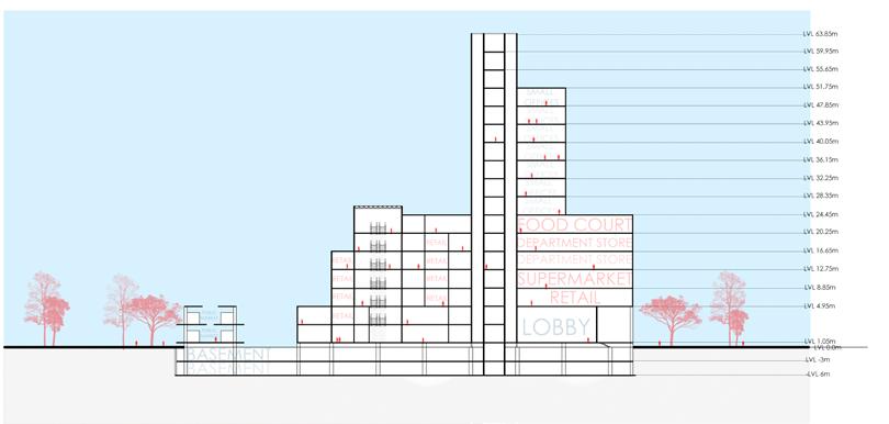 Raising the height of the office block to higher levels to create a landmark in the middle of the city, promoting the TOD.
