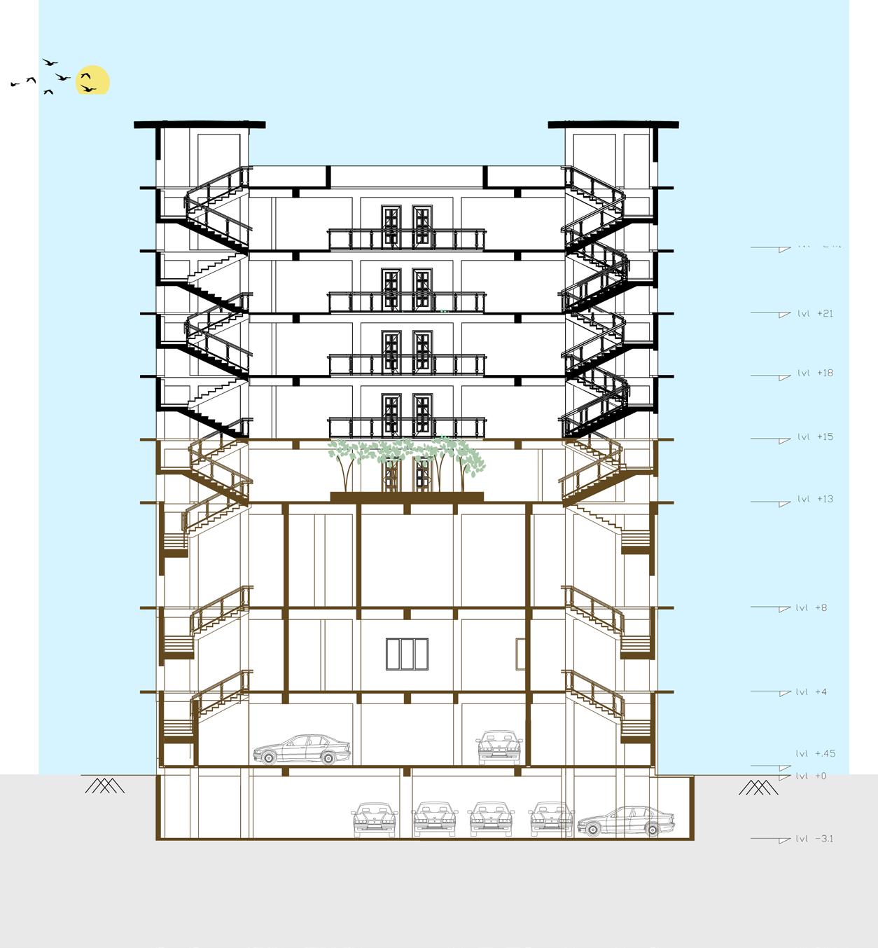 The present space has two openings on opposite sides and is triple-height. It is currently being used as a storage space. There is a common toilet attached to this space. The proposed space is located beneath the connecting bridges.