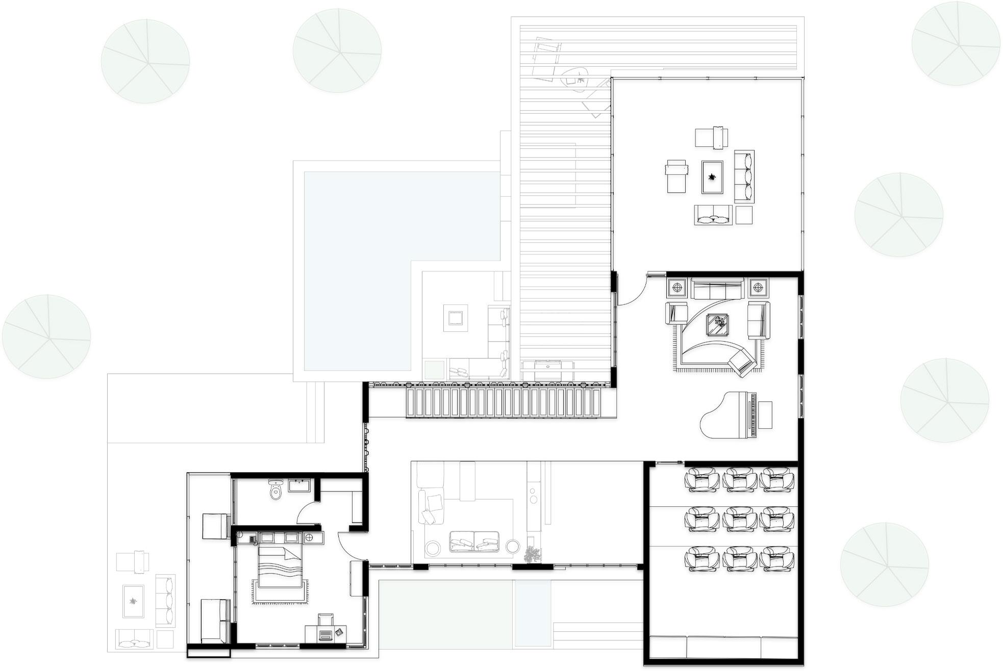 Vertical gardens have been incorporated in both openings to prevent direct sunlight from entering the space. Additionally, a mezzanine floor has been added to provide more seating space. The seating area has been designed to be flexible and multipurpose. The overall design approach is minimalistic and simple.