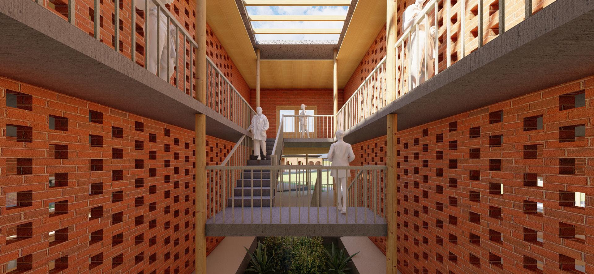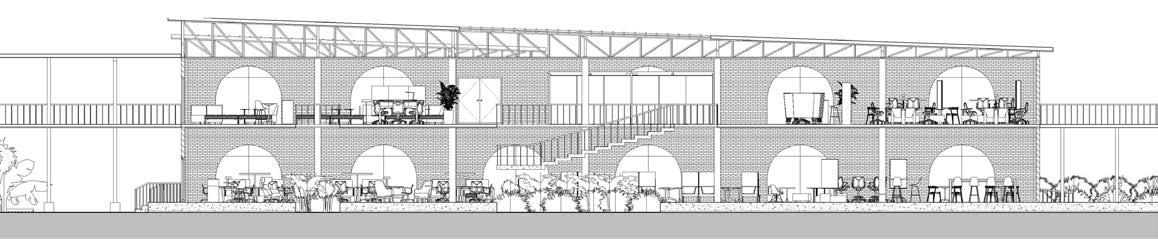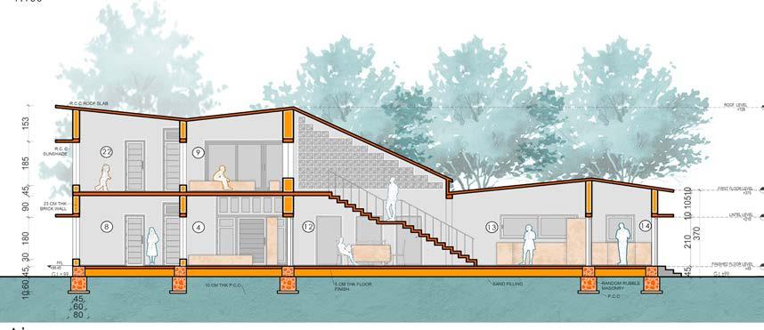 The long corridors have been utilized for serving meals to the community with a concept of a large open kitchen. It has been designed to actively create a street connection. Overall the community center acts as a multipurporse space creating visual connectivity and which can be adopted according to the required uses.
