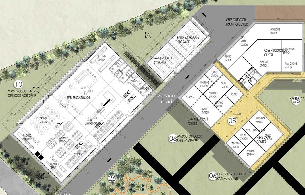 Softwares used : Revit, Lumion, Photoshop, AS406 / Semester 8 / College of Architecture 23 01 Security Cabin 02 Pedestrain Entry 03 Vehicular Entry 04 Vehicular Exit 05 Bamboo Forest Walk 06 Entry Plaza 07 Guest Parking 08 Admin Block 09 Restaurant 10 Dining Zone 11 Amphitheatre 12 Courtyard 13 Craft Bazaar 14 Learning Zone 15 Bamboo Seating 16 Production Center 17 Design Studio 18 Cane Crafts Center 19 Bamboo Crafts Center 20 Fiber Crafts Center 21 Mass Production 22 Outdoor working 23 Service Zone 24 Loading Bay 25 Guest Parking