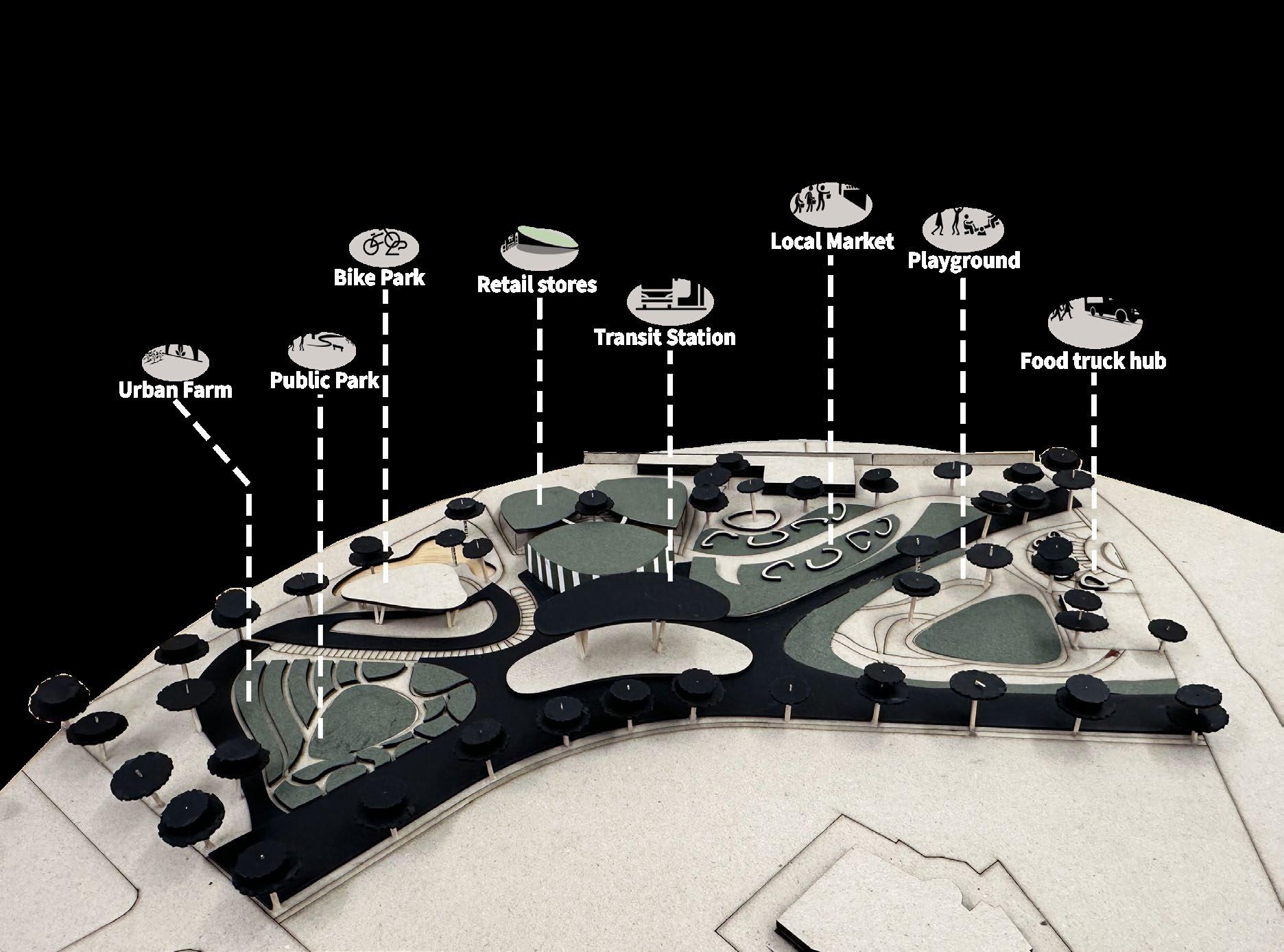 The proposal for a mobility hub focuses on creating a seamless connection between public transportation and community socializing activities by integrating a variety of programs. The hub will feature a bike park, an urban farm, retail stores, a food truck hub, a kids’ playground, and a local market. These elements aim to create a vibrant, multi-functional space where commuting is paired with opportunities for recreation, shopping, and socializing.