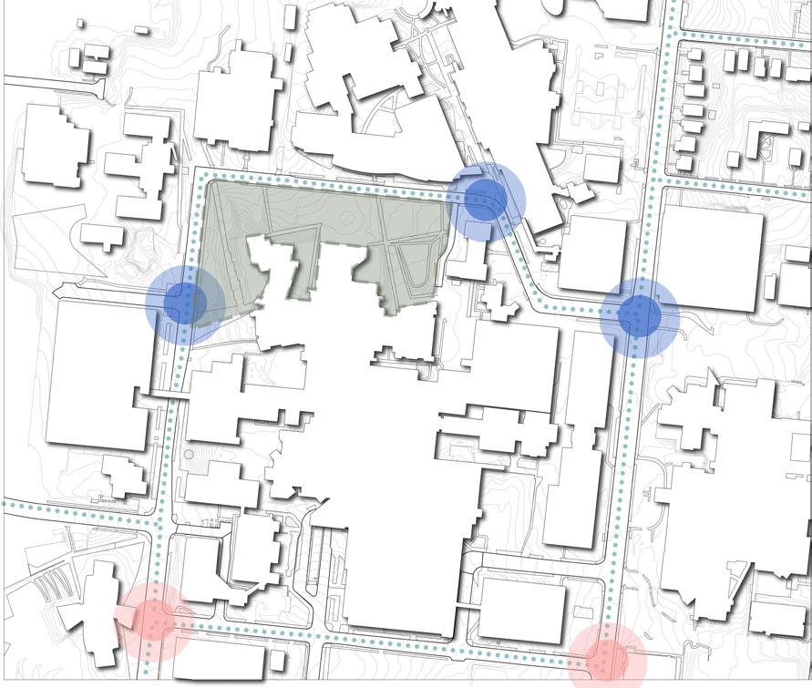 The highlighted blue nodes identifies the key locations of pedestrian and vehicular pathway. Identifying this location will help in spatial planning of the design to have elements of maximum importance to be placed close to