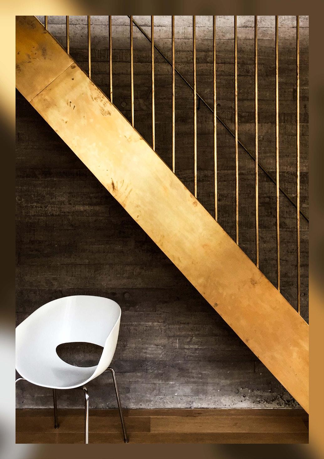 The brass staircase with textured concrete as the backdrop.