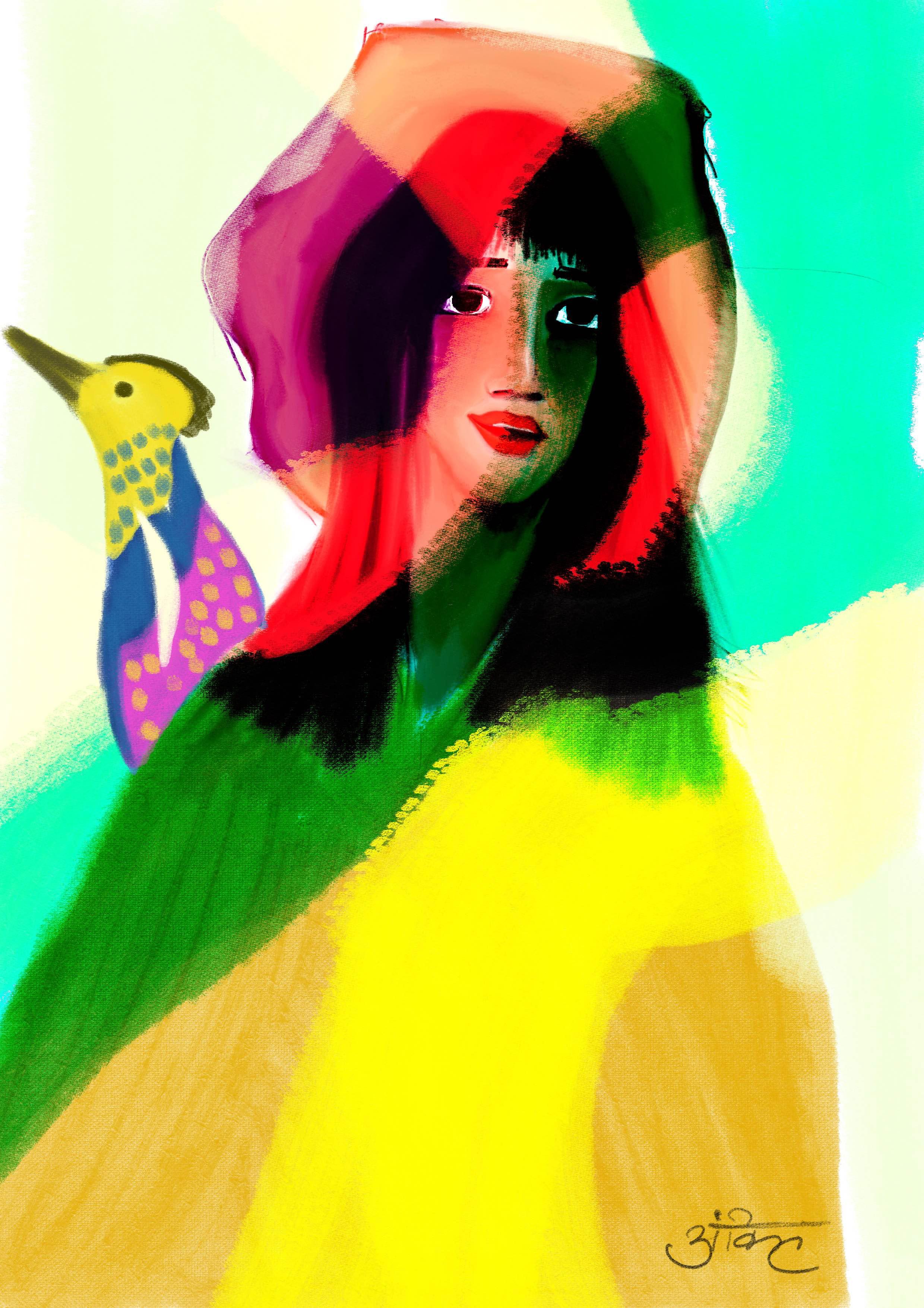 A vibrant portrait of a woman and a colorful bird, symbolizing her spirit of liberation and individuality. The bird represents her connection to boundless possibilities and her ability to soar beyond limits.