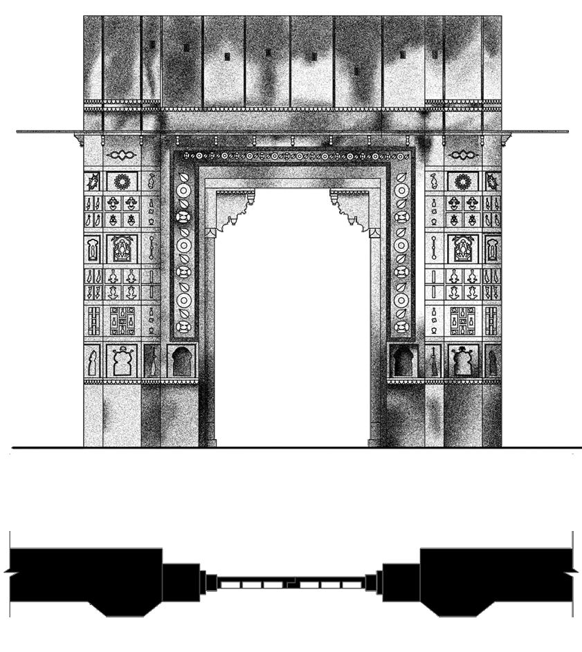 A striking arched gateway inspired by the architectural language of Bundi’s palaces and fortifications. The detailed lower section illustrates the seamless integration of traditional design into the urban and historic landscape of Rajasthan.