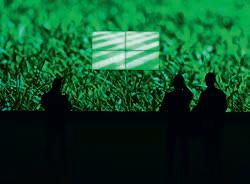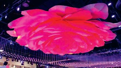 Like an enchanted garden that had been tipped on its head, the exhibit for Changhong Electric Co. Ltd. invited attendees to walk beneath a star-like sky of glowing, crimson-colored lotus flowers. Merging two significant symbols in Chinese culture (the lotus, which represents perfection; and the color red, signifying good fortune), the design may have foretold its own success. The focal point of the zen-like space was an in-booth theater placed beneath a massive fabric lotus flower that hovered overhead.