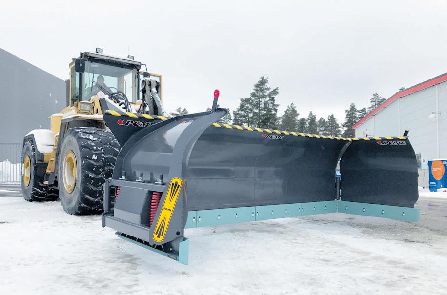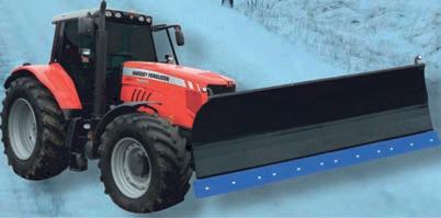 Sladda grusvägen, röj snö, runtomsvängande schaktblad, kan utrustas med sidoförskjutning. Stödhjul, tandstål i Olofsfors, sidovinge. 3 bredder: