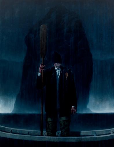 In this stark and unforgiving environment, an unidentified community endures a precarious existence without shelter. Stranded or perhaps in a state of perpetual waiting, figures balance barefoot on guano-coated rock faces and navigate the waters in wooden-hulled vessels, steered by hooded ferrymen through the treacherous sea stacks. Their weatherbeaten appearance is marked by salt-stung, red-tinged eyes and skin. Currie's paintings are imbued with imagery evocative of inherited folklore, ritual, and faith.