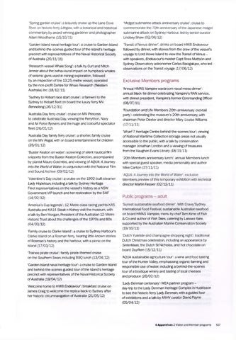 ‘Research vessel Whale Song: a talk by Curt and Mitch Jenner about the behavioural impact on humpback whales of seismic guns used in mining exploration, followed by an inspection of the 13.25-metre vessel, operated by the non-profit Centre for Whale Research (Western Australia) Inc (18/12/11) ‘Sydney to Hobart race start cruise’: a farewell to the Sydney to Hobart fleet on board the luxury ferry MV Bennelong (26/12/11) ‘Australia Day ferry cruise’: cruise on MV Princess to celebrate Australia Day, viewing the Ferrython, Navy and Air Force flyovers and the huge and colourful spectator fleet (26/01/12) ‘Australia Day family ferry cruise’: a shorter, family cruise on the MV Regal, with on board entertainment for children (26/03/12) ‘Buster Keaton on water’: screening of silent nautical film snippets from the Buster Keaton Collection, accompanied by pianist Mauro Colombis, and viewing of AQUA: A Journey into the World of Water, in conjunction with the National Film and Sound Archive (09/02/12) ‘Valentine’s Day cruise’: a cruise on the 1902-built steamer Lady Hopetoun, including a talk by Sydney Heritage Fleet representatives on the vessel's history as a NSW Government VIP launch and her restoration by the SHF (14/02/12) 'America’s Cup legends': 12-Metre class racing yachts KA5 Australia and KA14 Steak n Kidney visit the museum, with a talk by Ben Morgan, President of the Australian 12-Metre Historic Trust about the challenges of the 1970s and 80s (04/03/12) ‘Family cruise to Clarke Island’: a cruise to Sydney Harbour's Clarke Island on a Rosman ferry, hearing little-known stories of Rosman’s history and the harbour, with a picnic on the island (17/03/12) Trainee pirate cruise’: family pirate-themed cruise on the Southern Swan, including BBQ lunch (13/04/12) ‘Garden Island naval heritage tour’: a cruise to Garden Island and behind-the-scenes guided tour of the island’s heritage precinct with representatives of the Naval Historical Society of Australia (19/04/12) ‘Welcome home to HMB Endeavourbreakfast cruise on James Craig to welcome the replica back to Sydney after her historic circumnavigation of Australia (21/05/12)