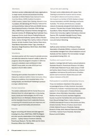 Members section collaborated with many organisations to stage events, lectures and seminars including: Australian 12-Metre Historic Trust, Carnival Cruises, Coral Sea Wines, CSIRO, Duyfken Foundation, HCBS Charters, Laissez Faire Catering, Mawson’s Huts Foundation, MV Bennelong, MV Princess, National Film and Sound Archive, National Parks and Wildlife Service, Naval Historical Society of Australia, NSW Heritage Office, NSW Primary Industries Fisheries Management, Rosman’s Ferries, RV Whalesong, Royal Australian Navy, Seapower Centre, South Steyne Floating Restaurant, Sydney Catchment Authority, Sydney Harbour Wooden Boats, Sydney Heritage Fleet, Sydney Institute of Marine Science, tall ship Southern Swan, Sydney Observatory, Tribal Warrior Association Svitzer Tugs, University of Tasmania, Village Roadshow, World Vision, World Wide Fund for Nature.