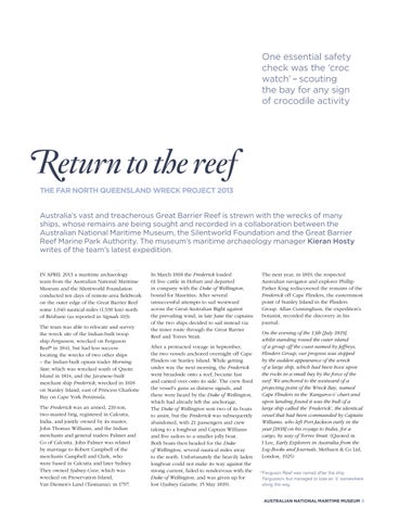 IN APRIL 2013 a maritime archaeology team from the Australian National Maritime Museum and the Silentworld Foundation conducted ten days of remote-area fieldwork on the outer edge of the Great Barrier Reef some 1,040 nautical miles (1,930 km) north of Brisbane (as reported in Signals 103).