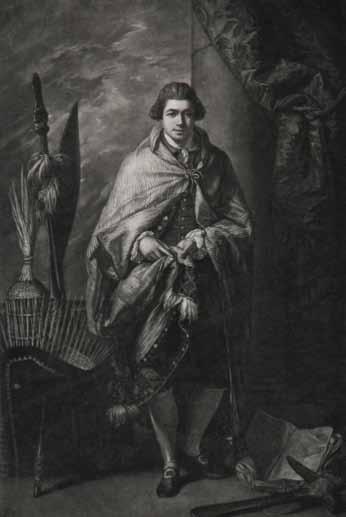 top left: banks wears a maori flax cape; around him are a basketwork helmet, club, canoe paddle, adze and an album of botanical specimens open at banksia. mezzotint engraved by J r Smith after a painting by benjamin West, published london 1788. aNmm Collection