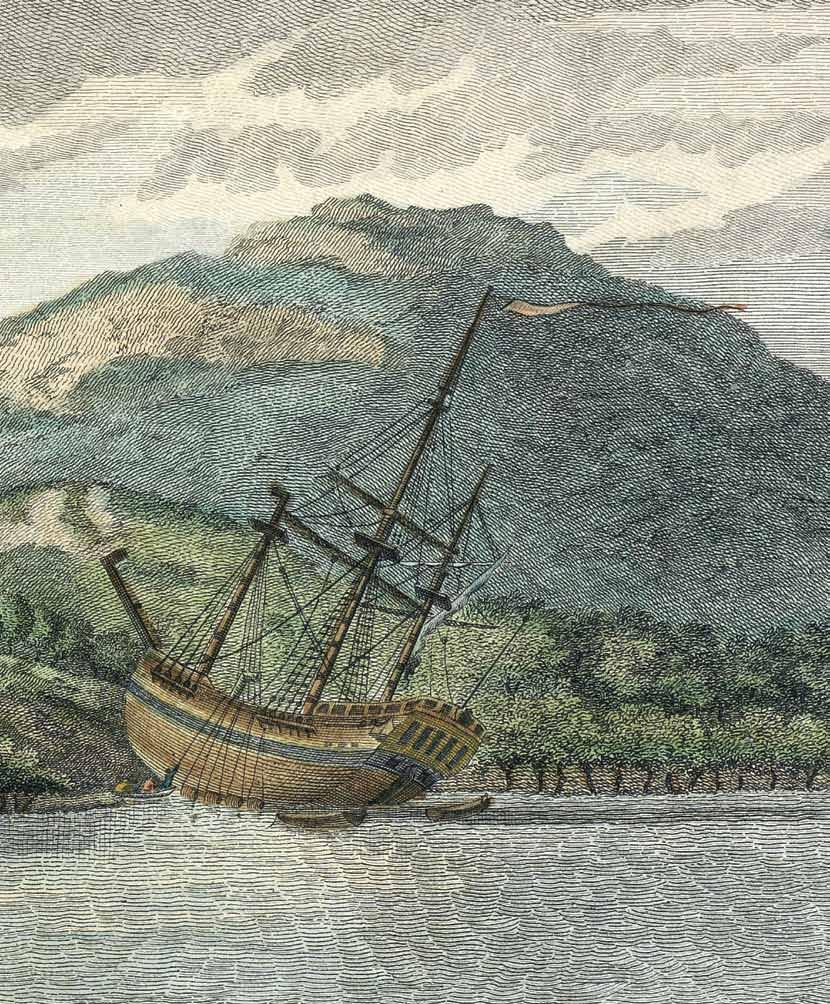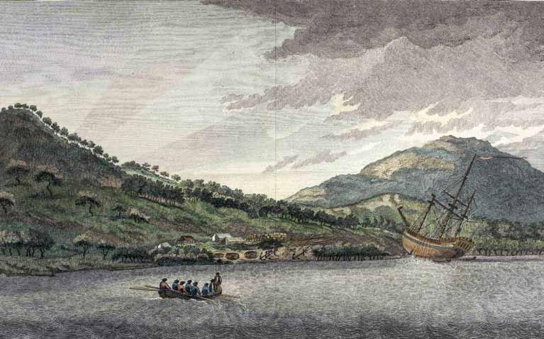 left: Endeavour being repaired after grounding on the great barrier reef. Vue de la Rivière d’Endeavour sur la côte de la Nouvelle Hollande ou le vaisseau mis a la bande (view of endeavour river … the bark laid on the shore). Hand coloured engraving after a drawing by Sydney parkinson, published paris, France 1774. aNmm collection