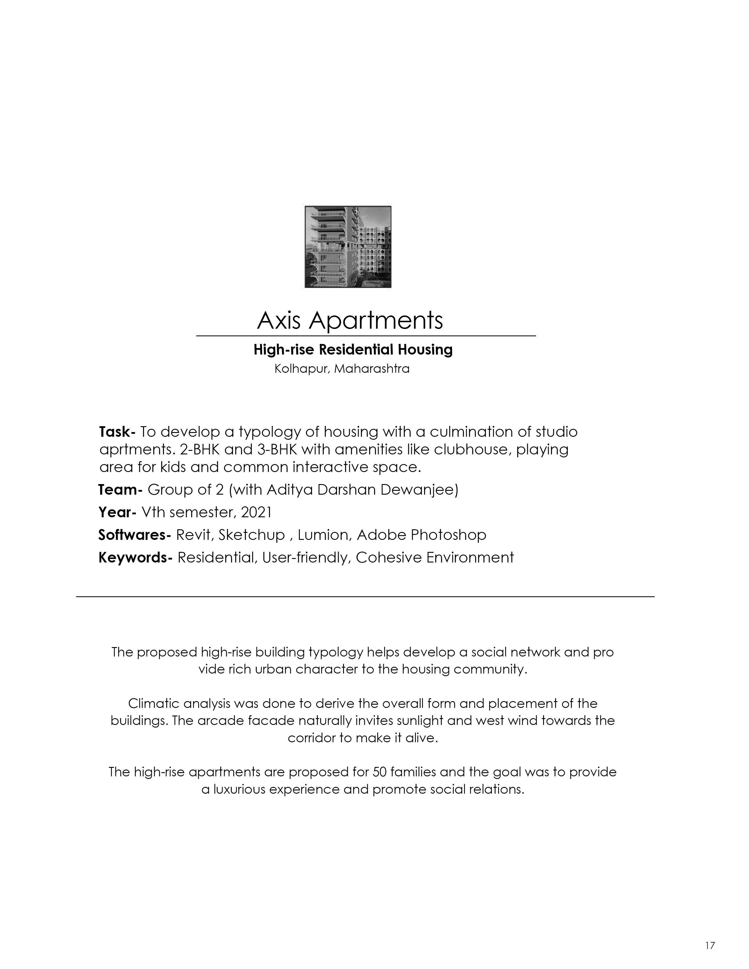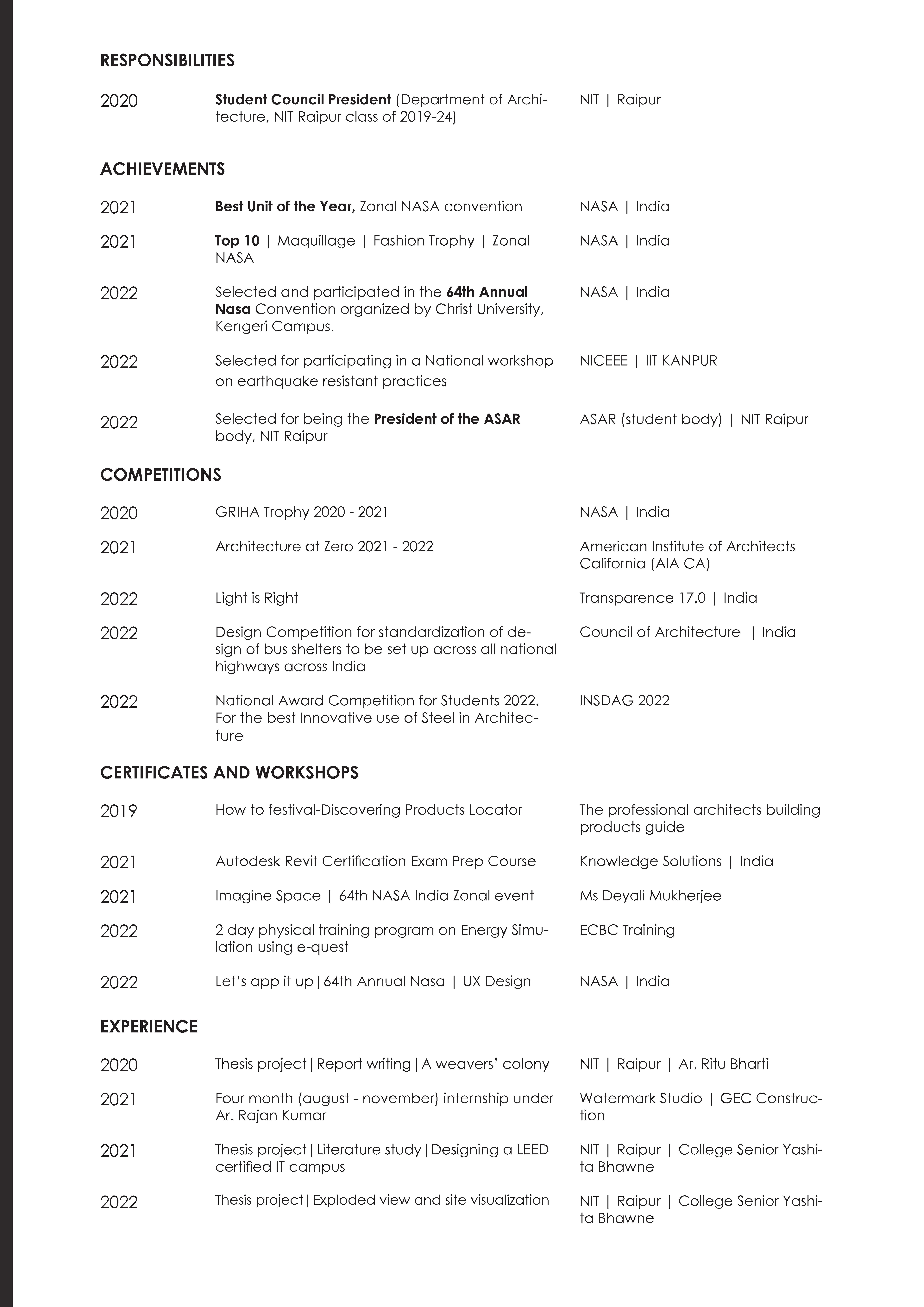 I am a 21 year, architecture student studying in my 4th year at the National Institute of Technology Raipur, Raipur, India. The following Portfolio is a collection of selected works from my three and a half years as a student practitioner and freelancer. It showcases several of my interests and skills through my projects.