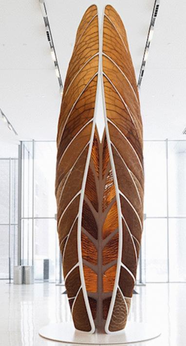 Aguahoja, 2018. Upon exposure to rain water, the biopolymer pavilion will degrade programmatically, returning to the earth and fueling new growth;The Mediated Matter Group.