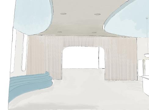 The ceiling element shows the idea of fluidity due to the fabric hanging from the ceiling. It will also provide in wayfinding from room to room.