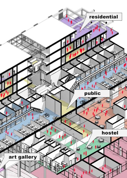 Historically an epidemic hospital, the art collective Konstepidemin is facing challenges due to the lack of diversity among its resident artists and declining relevance within central Gothenburg. The project views Konstepidemin as a Palimpsest, aiming to preserve its historical layers and introverted identity while introducing a new layer with complementary extroverted qualities to enhance collaboration and relevance. To promote diversity, art students are welcomed to communal workshops established to encourage collaboration. Vertical extensions facilitate co-working and educational workshops, while outdoor structures include flexible studios and outdoor workshops, catering to diverse stakeholder interests. The lightweight timber structure of the extensions respects existing historical buildings, while the foldable facades enhance connectivity between interior and exterior spaces, promoting communication and vitality.